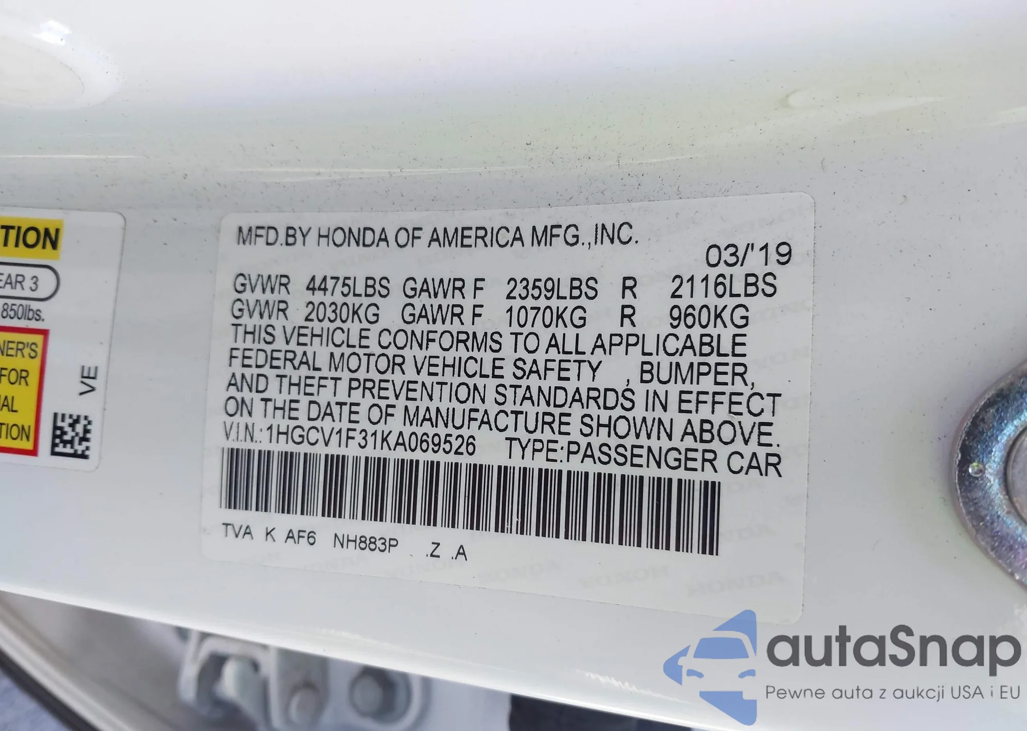 • VIN 1HGCV1F31KA069526