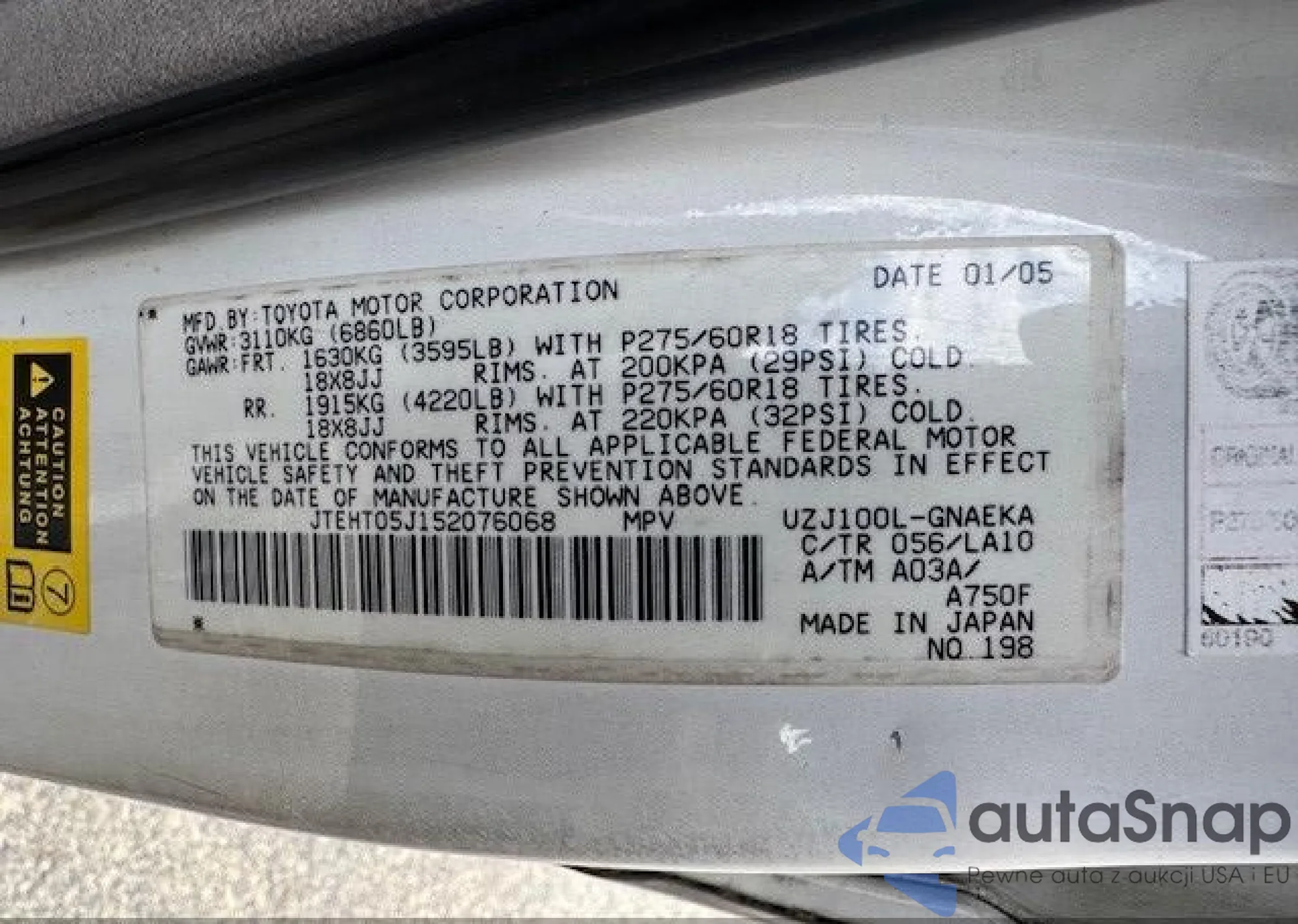 LOT: 43769583 VIN: JTEHT05J152076068