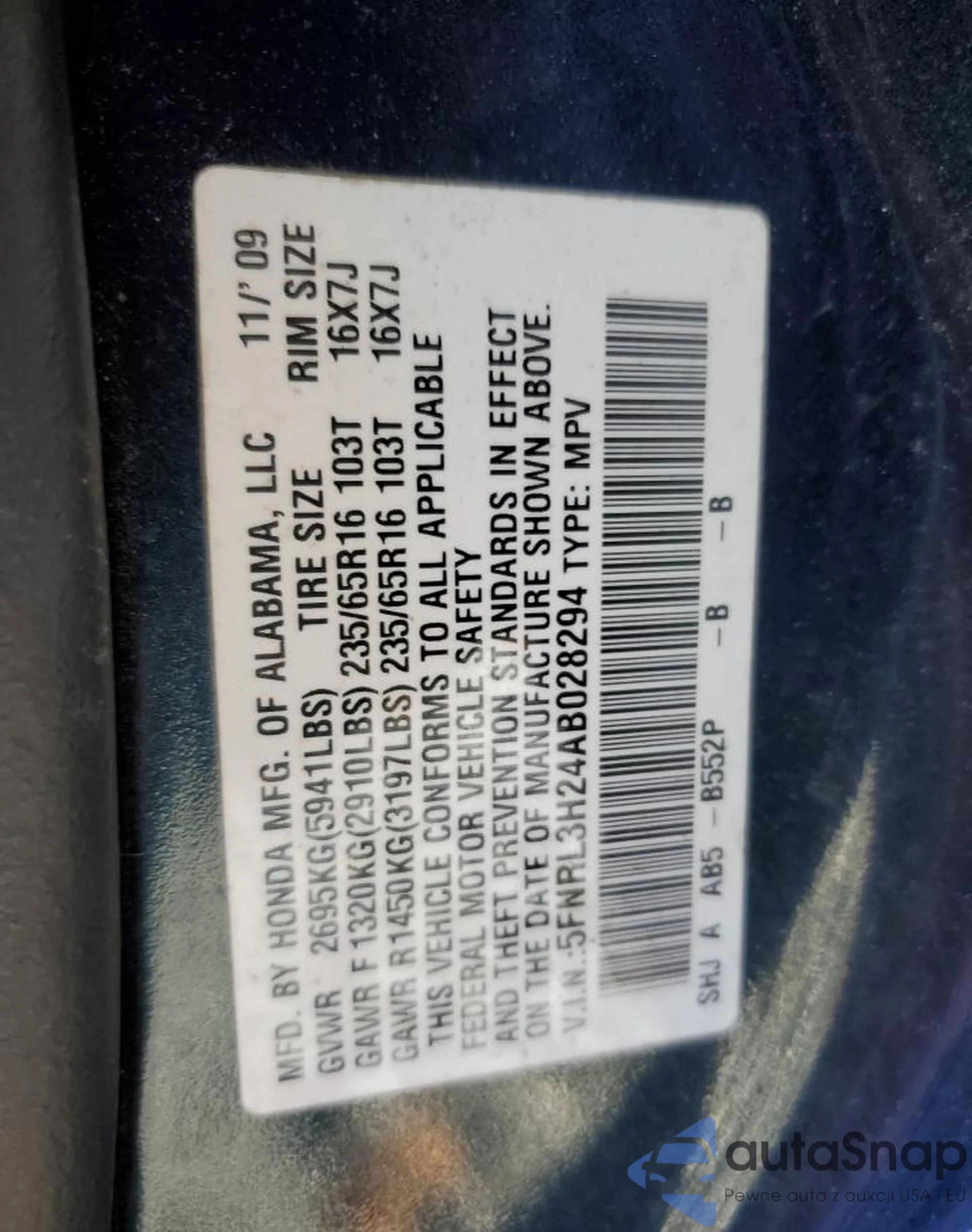 • VIN 5FNRL3H24AB028294