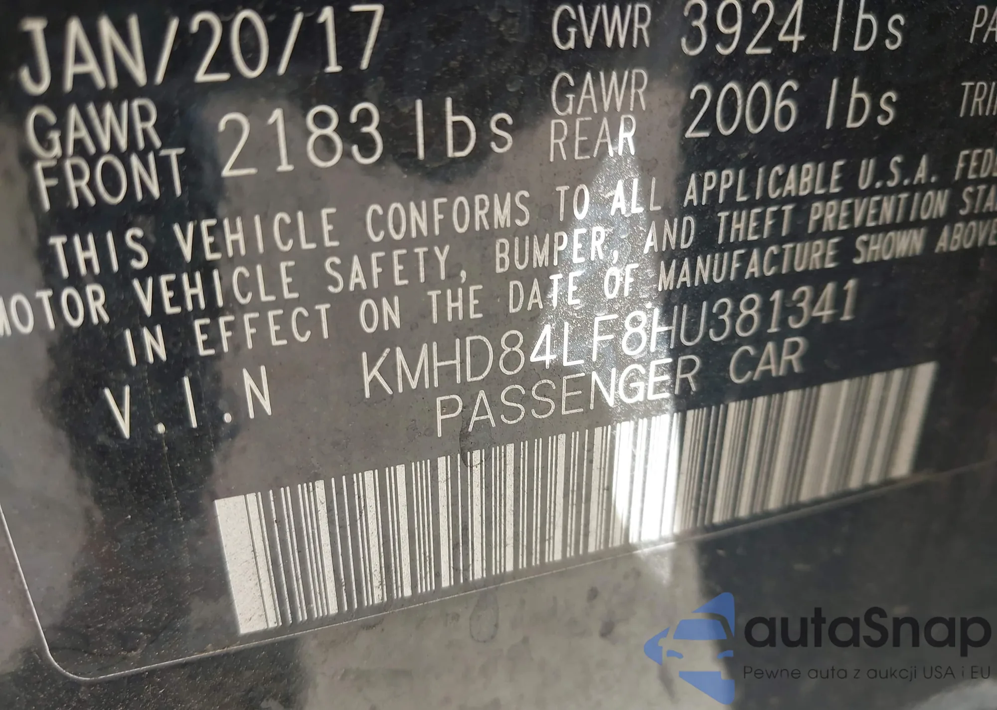 LOT: 43572067 VIN: KMHD84LF8HU381341