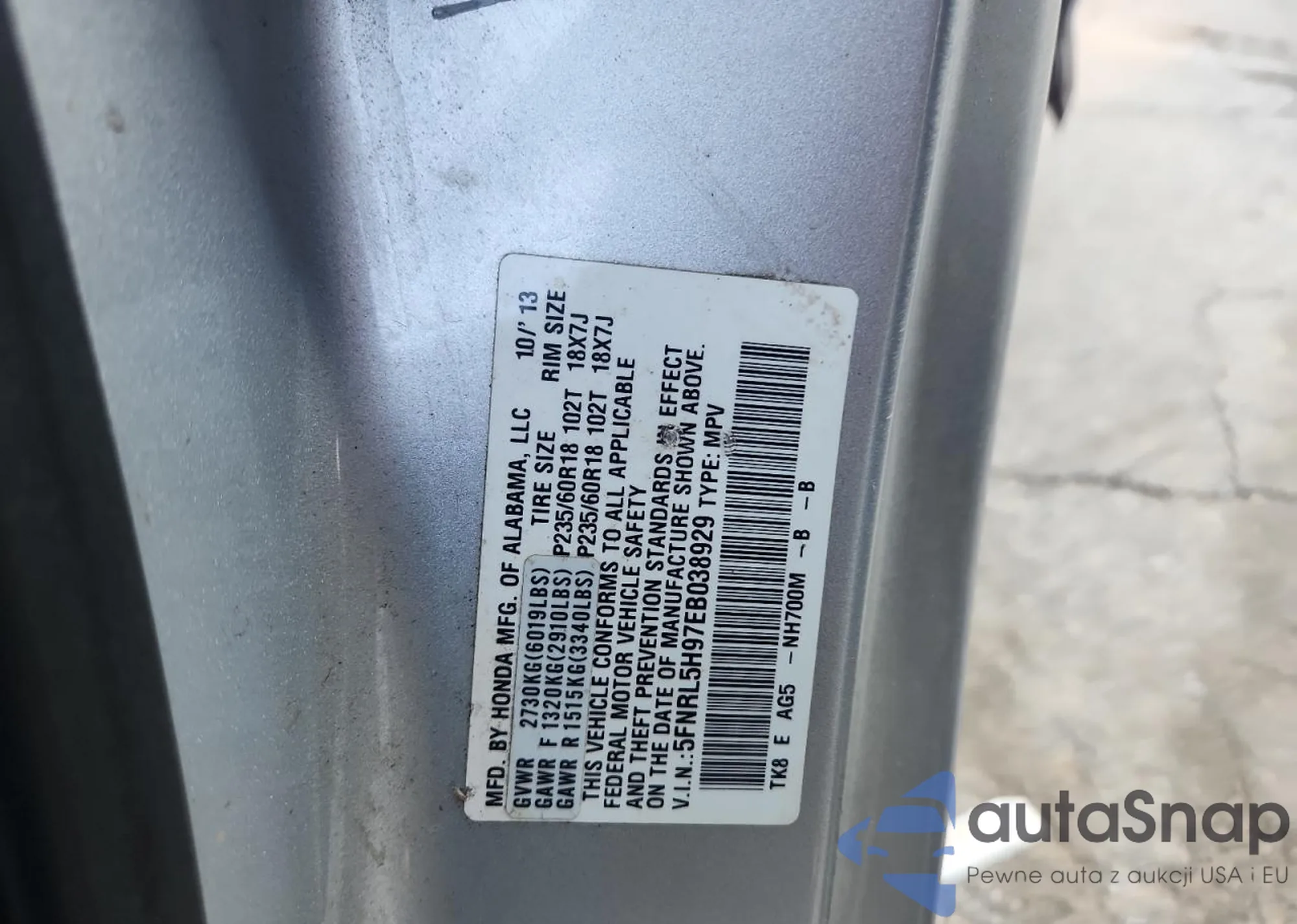• VIN 5FNRL5H97EB038929