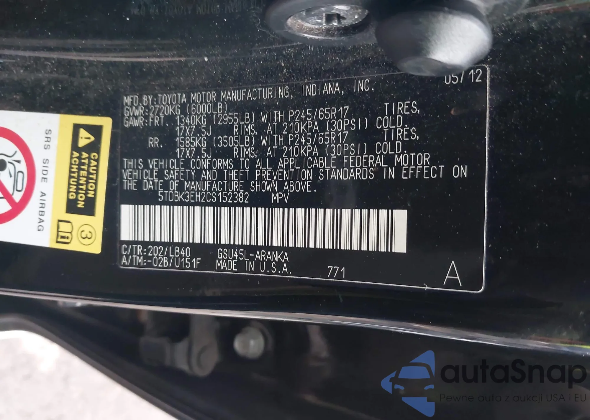 LOT: 43779218 VIN: 5TDBK3EH2CS152382