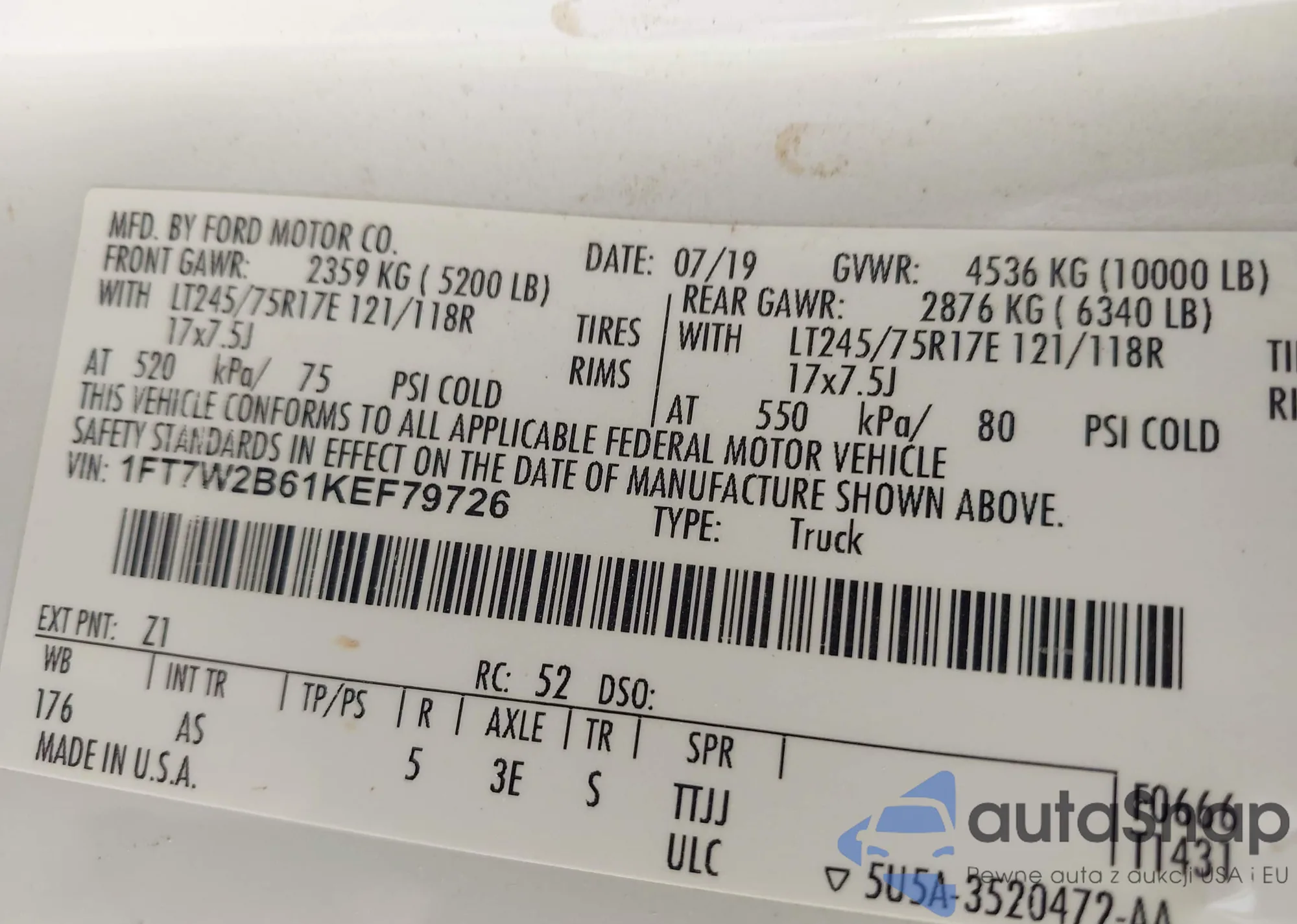 • VIN 1FT7W2B61KEF79726