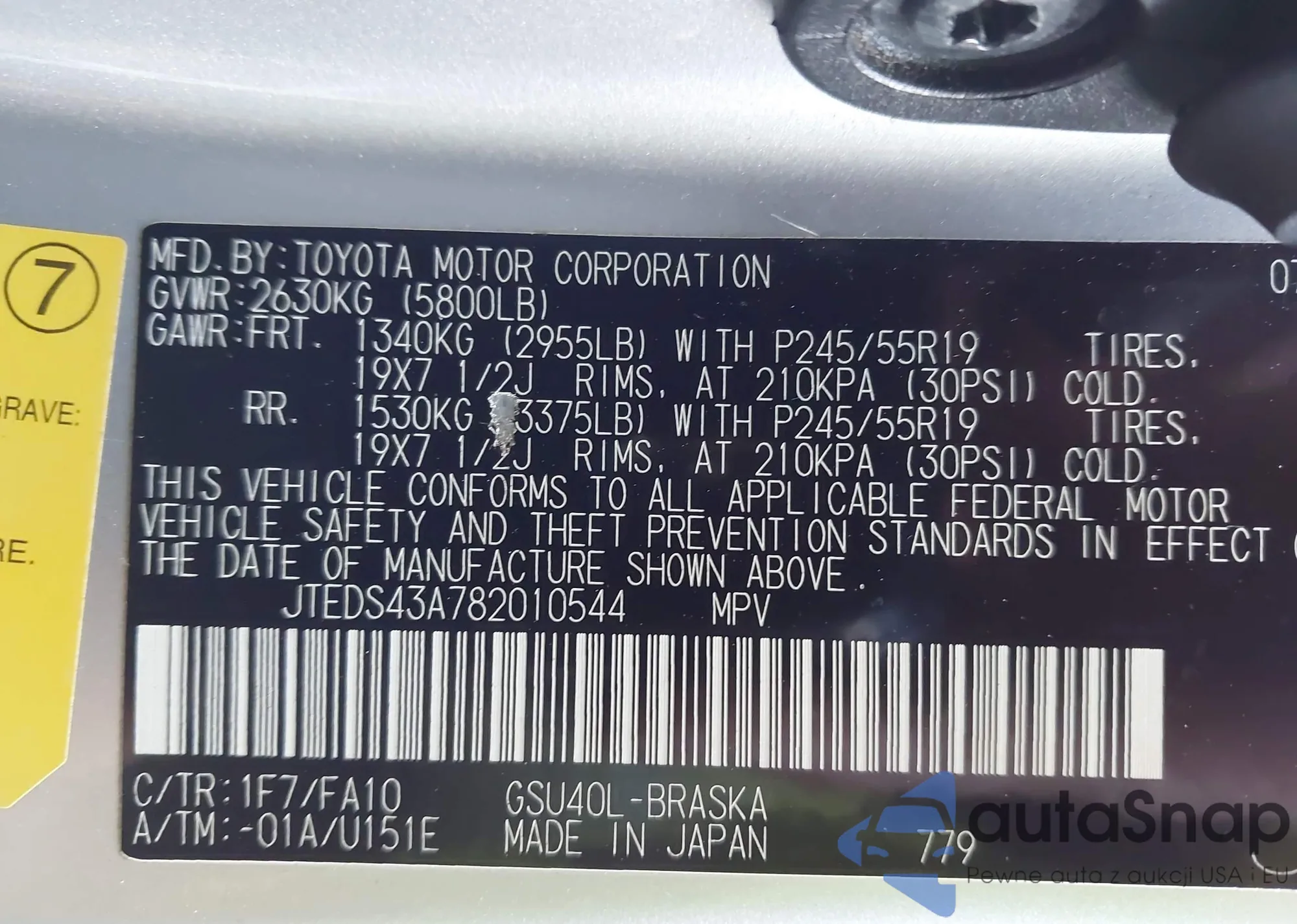 LOT: 43627031 VIN: JTEDS43A782010544