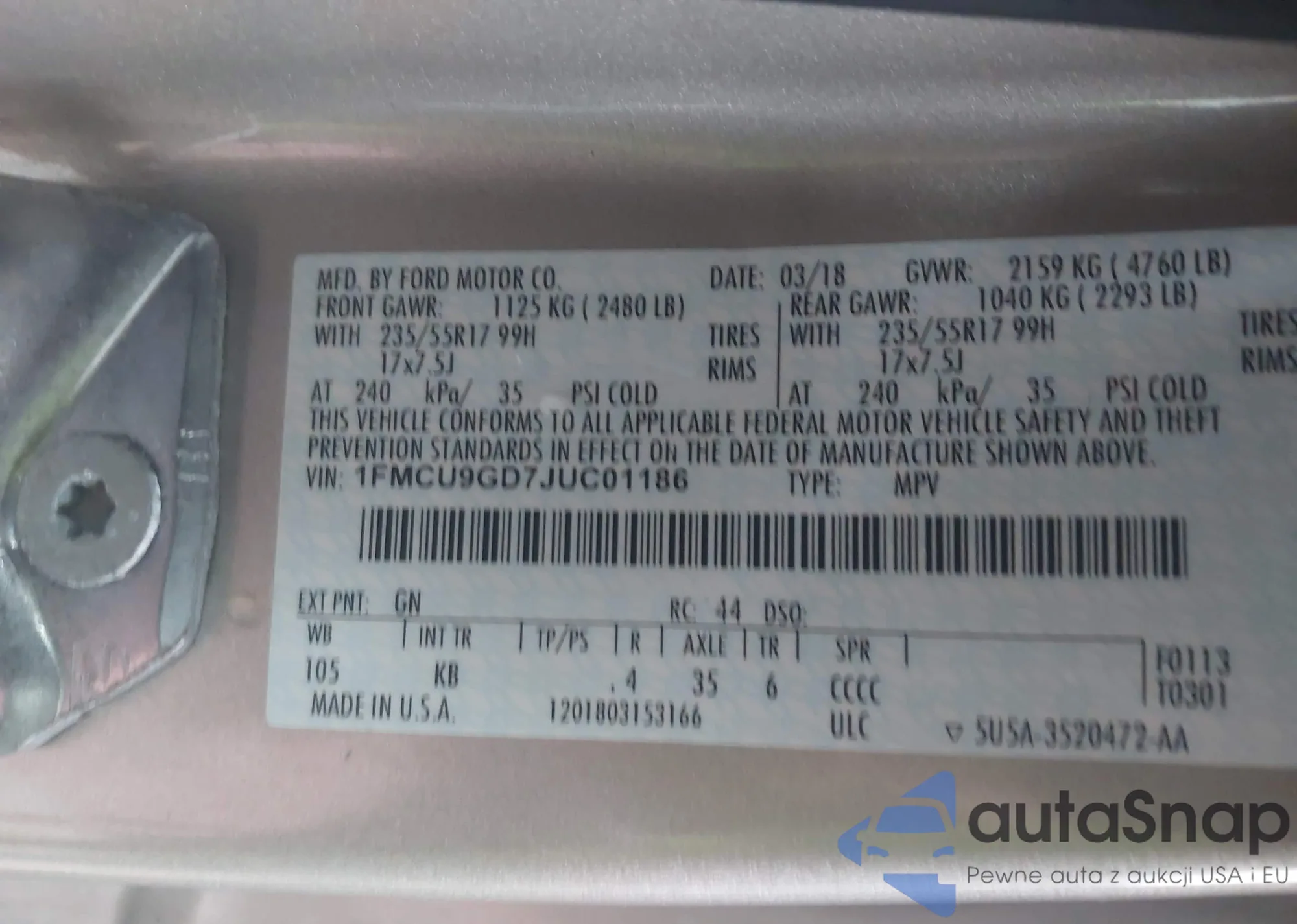• VIN 1FMCU9GD7JUC01186