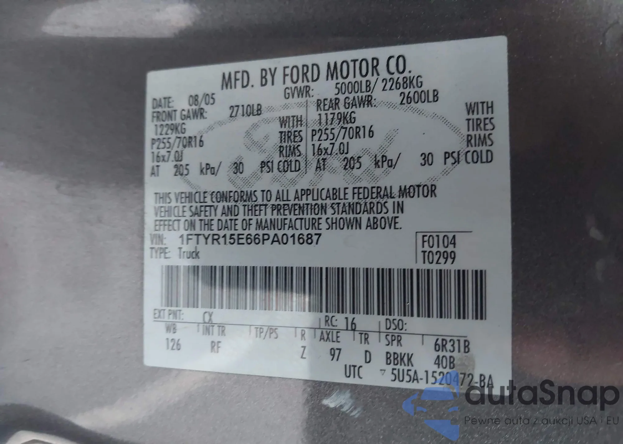 LOT: 43787805 VIN: 1FTYR15E66PA01687