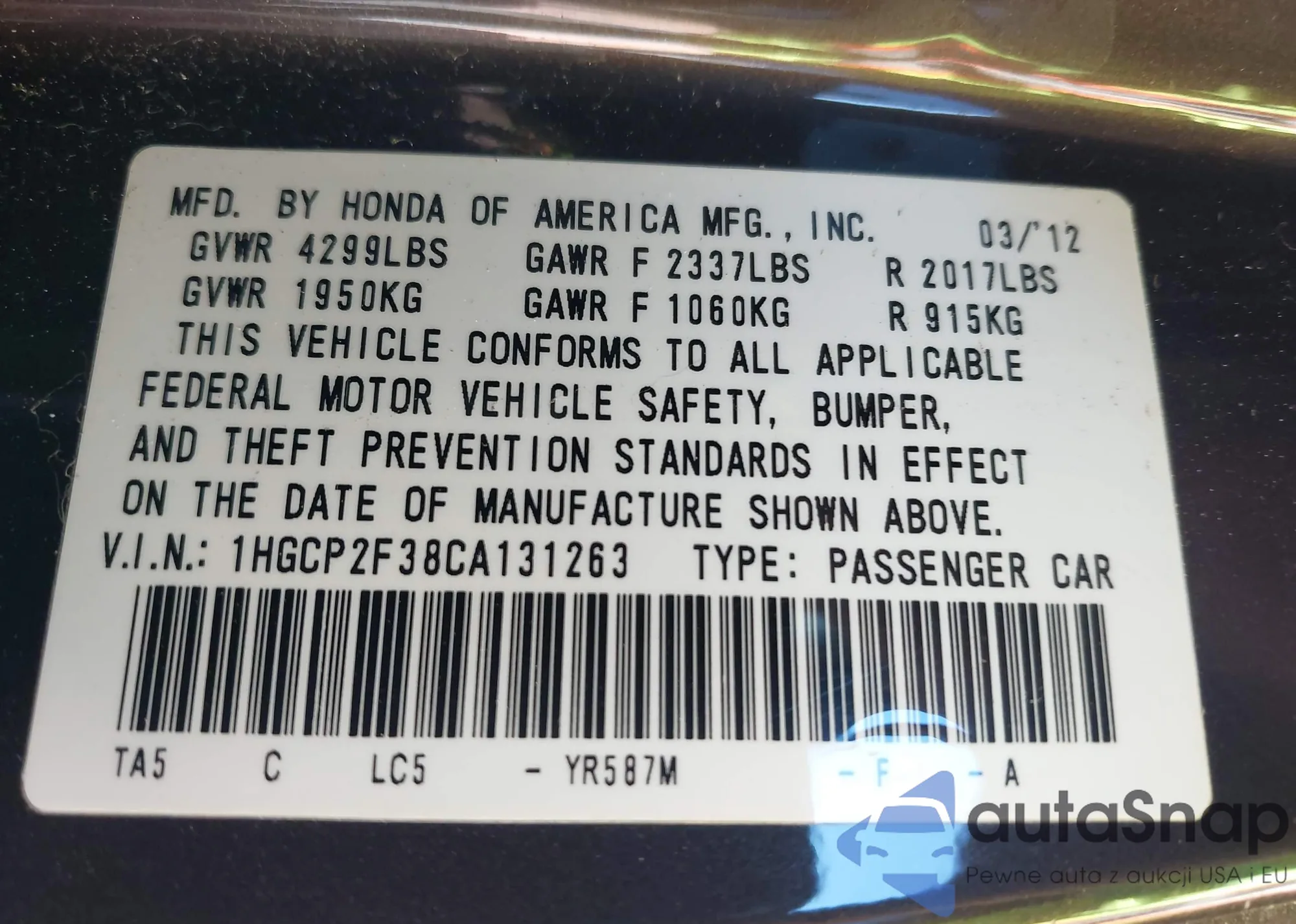 LOT: 42723090 VIN: 1HGCY2F60RA092636