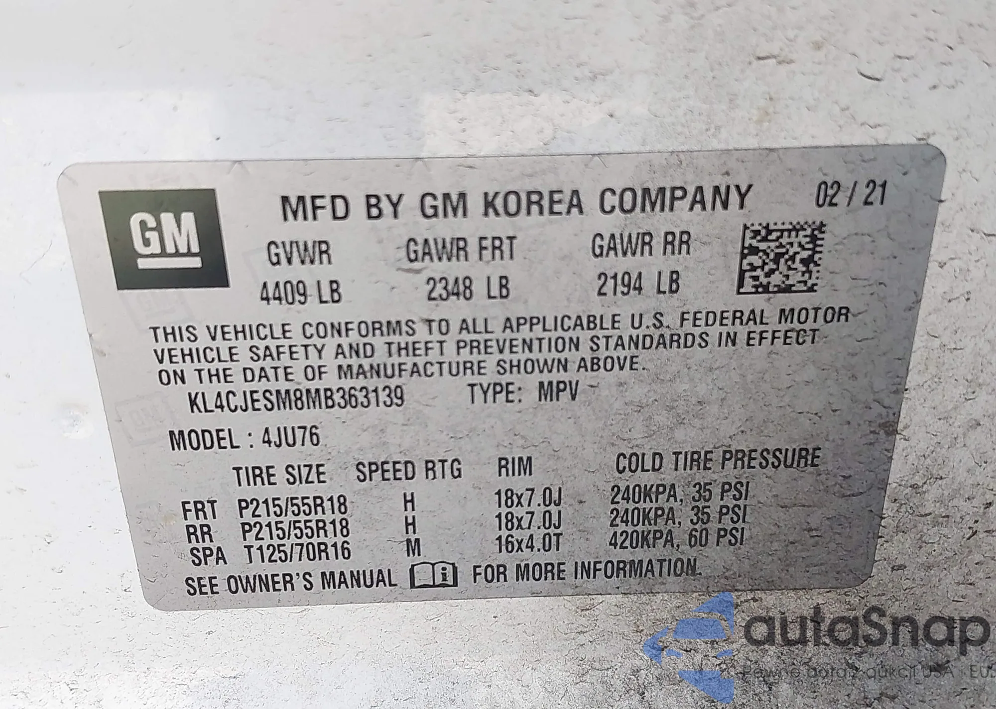 LOT: 43127783 VIN: KL4CJESM8MB363139
