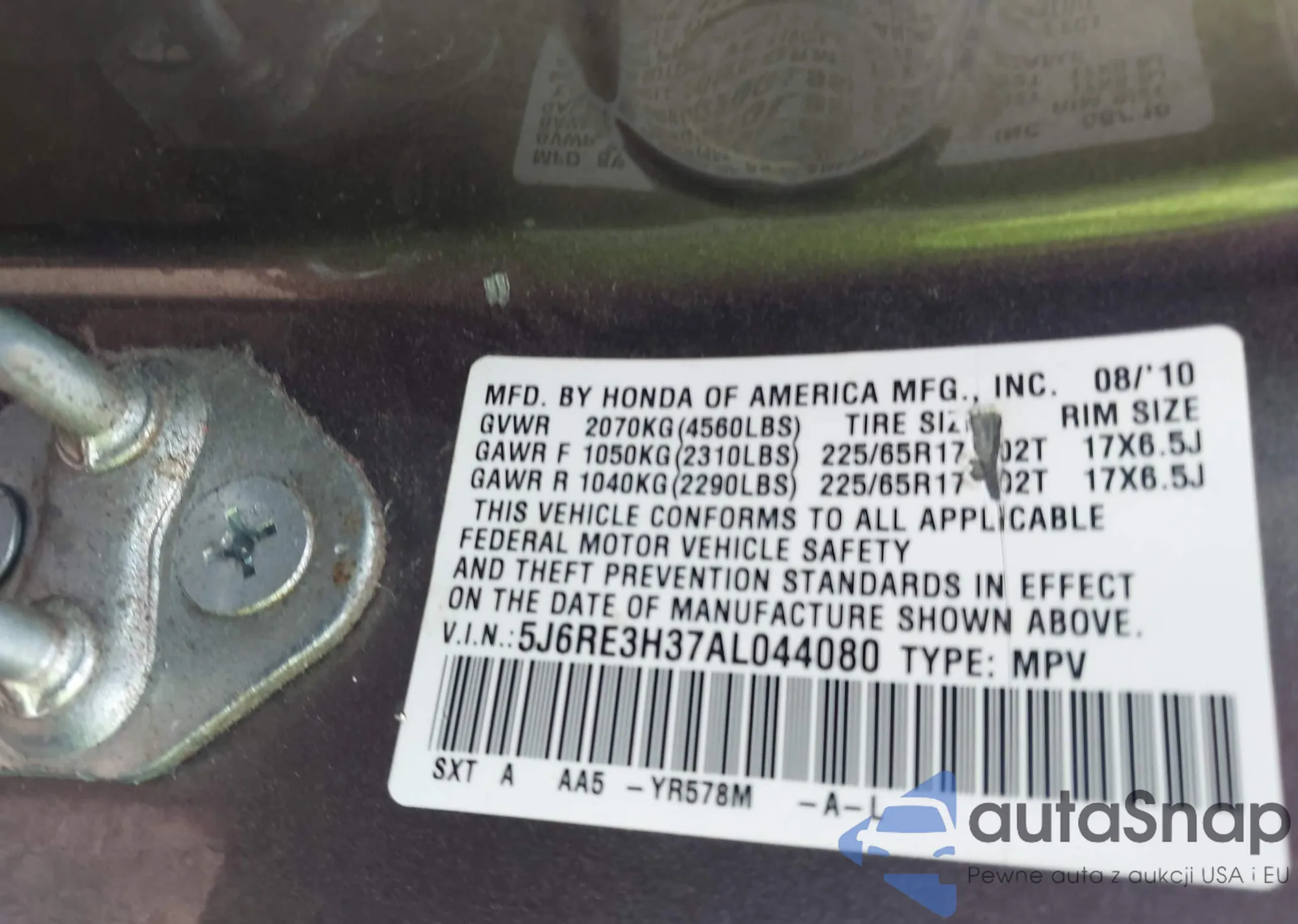• VIN 5J6RE3H37AL044080
