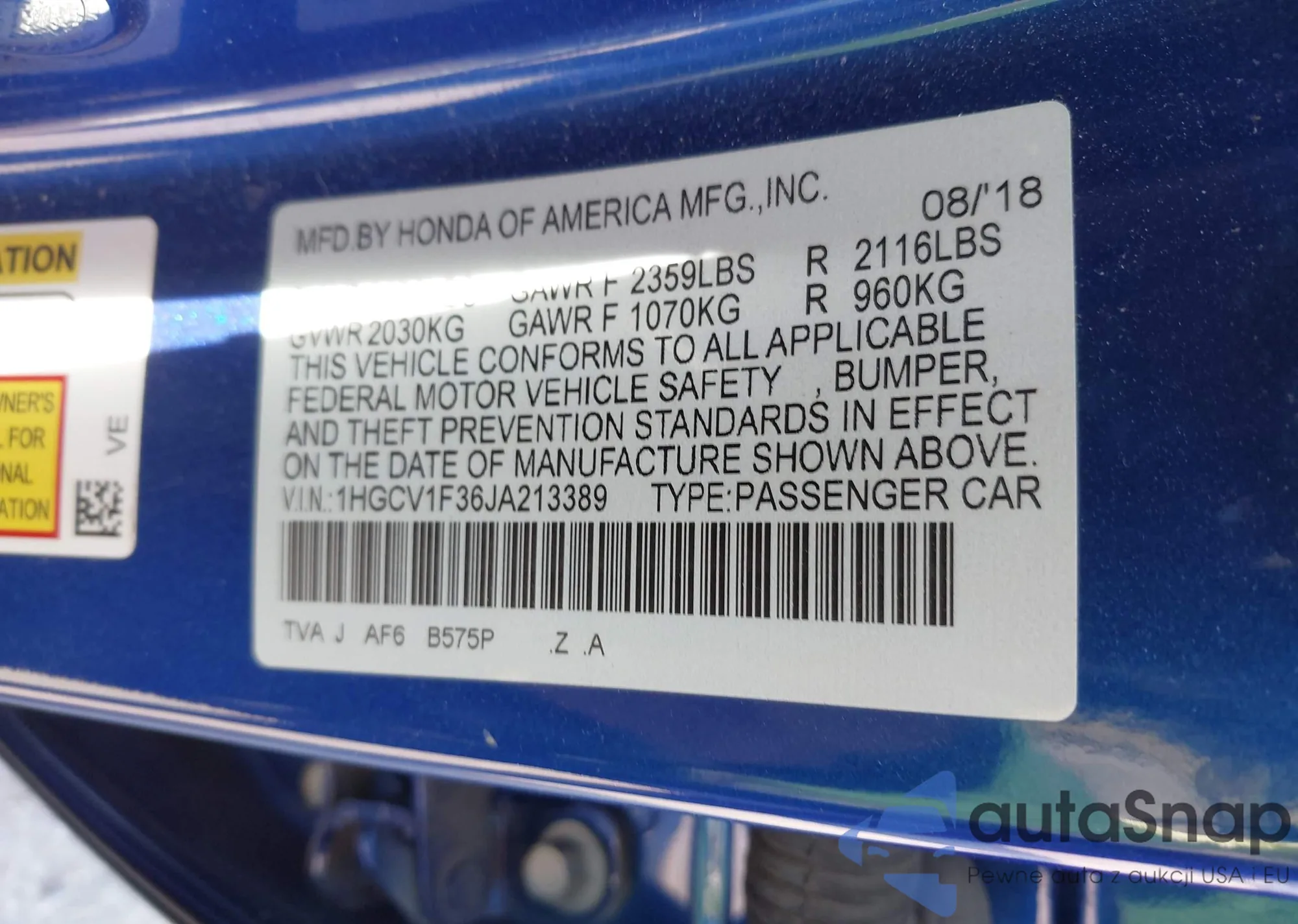 • VIN 1HGCV1F36JA213389