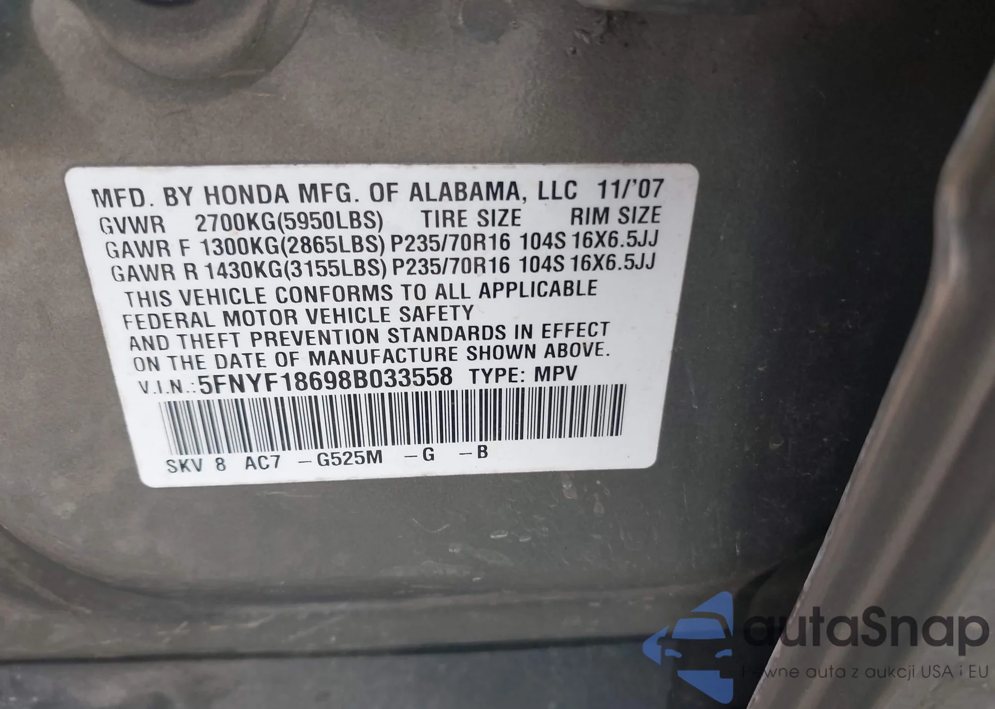 LOT: 42954607 VIN: 5FNYF18698B033558