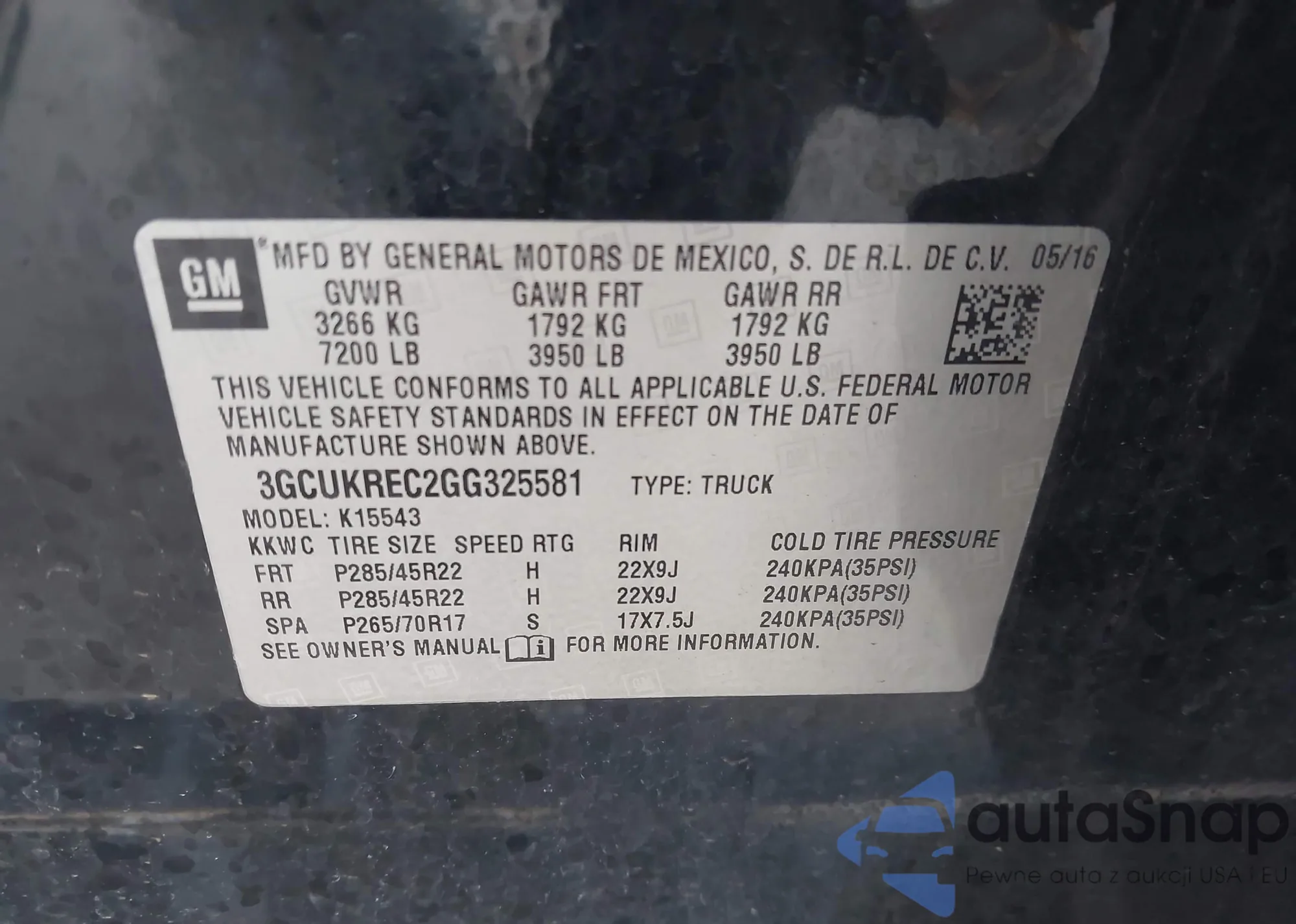 LOT: 43292968 VIN: 3GCUKREC2GG325581