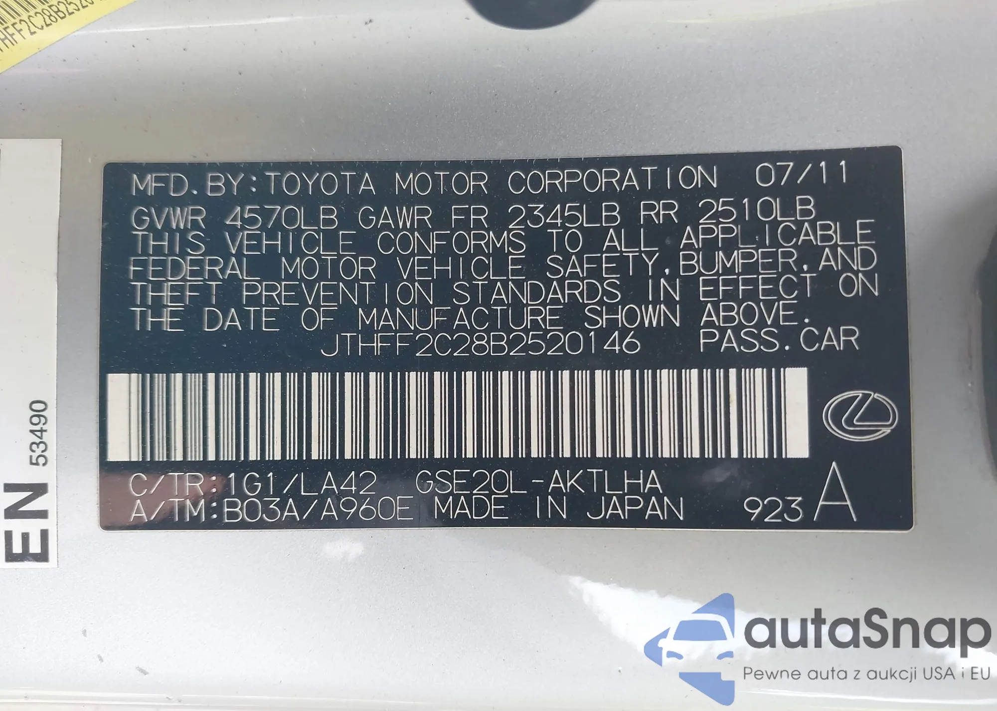 LOT: 43357570 VIN: JTHFF2C28B2520146