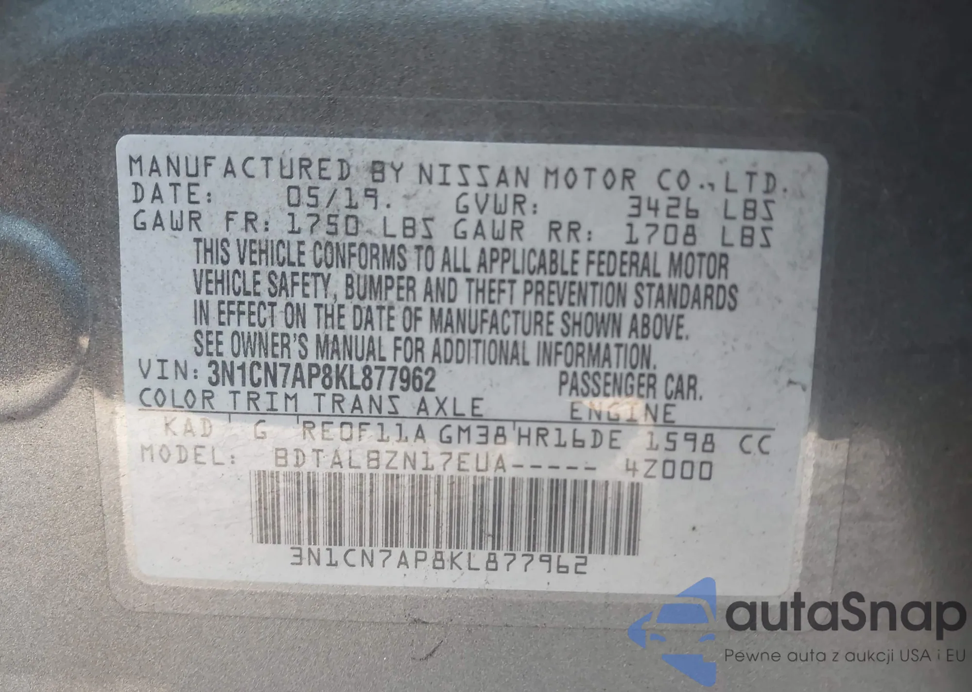 • VIN 3N1CN7AP8KL877962