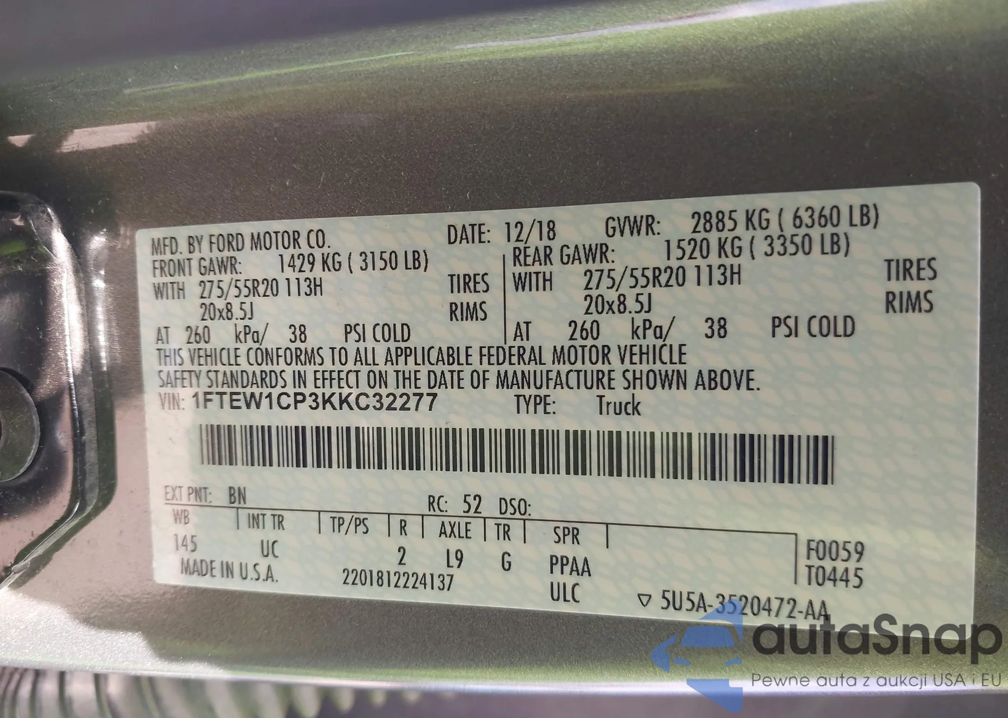 • VIN 1FTEW1CP3KKC32277