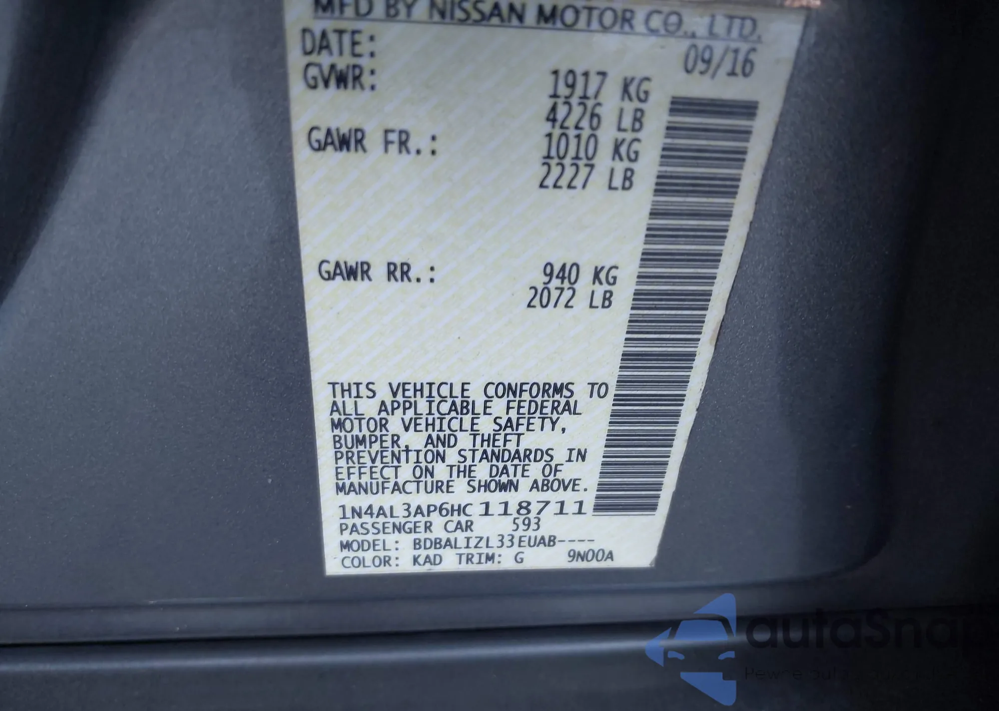 • VIN 1N4AL3AP6HC118711
