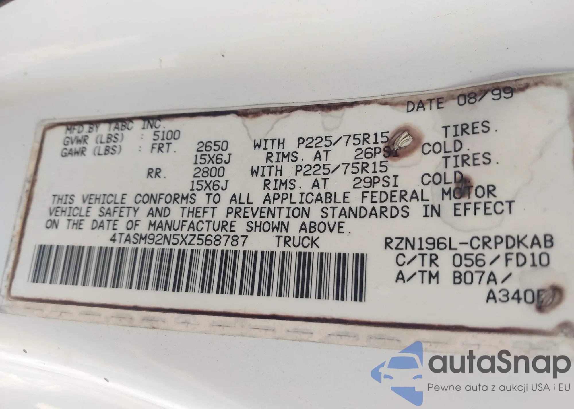 • VIN 4TASM92N5XZ568787