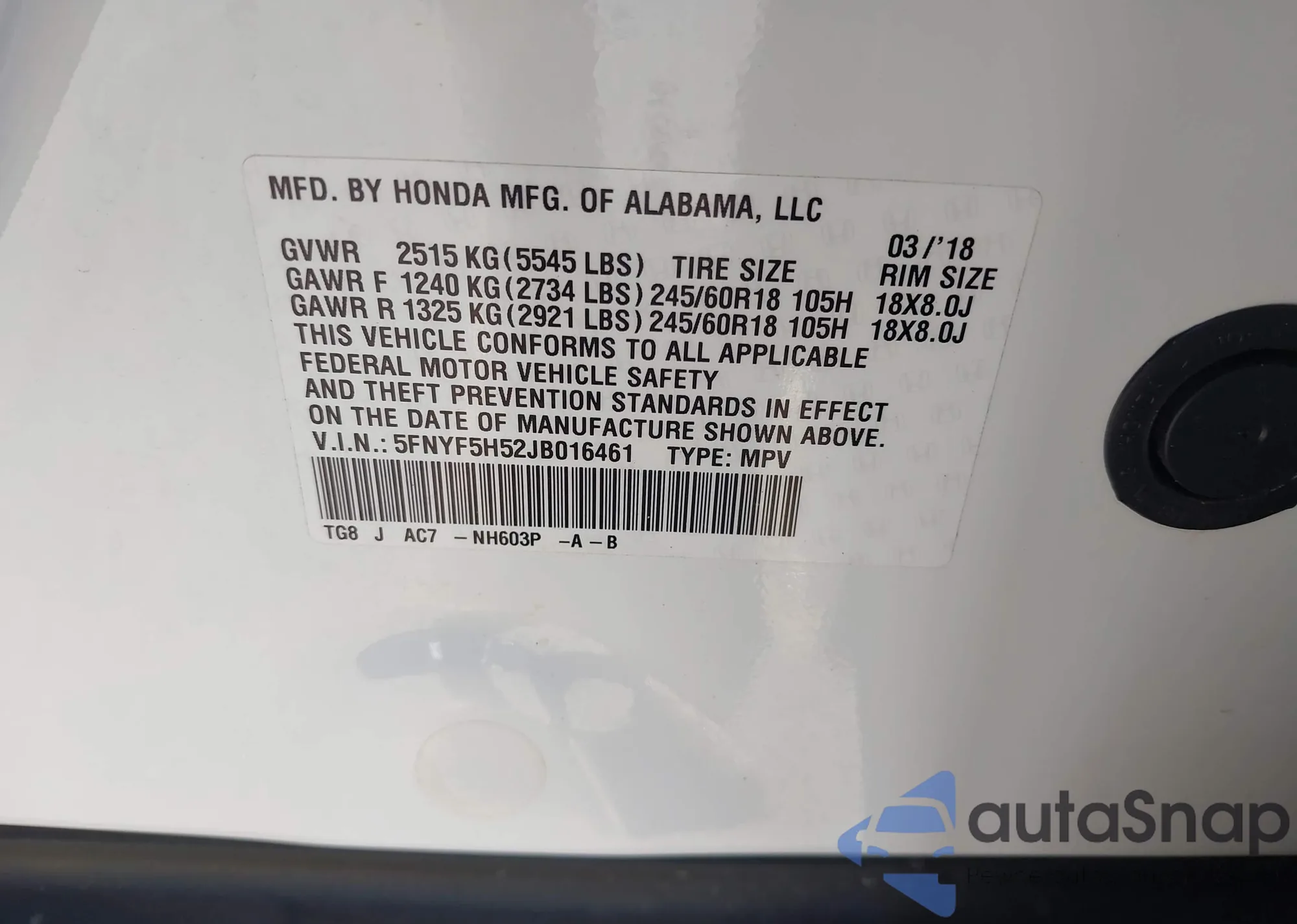 • VIN 5FNYF5H52JB016461