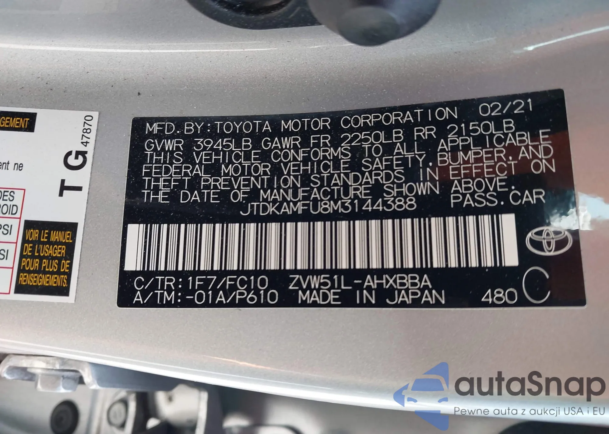 LOT: 43617223 VIN: JTDKAMFU8M3144388