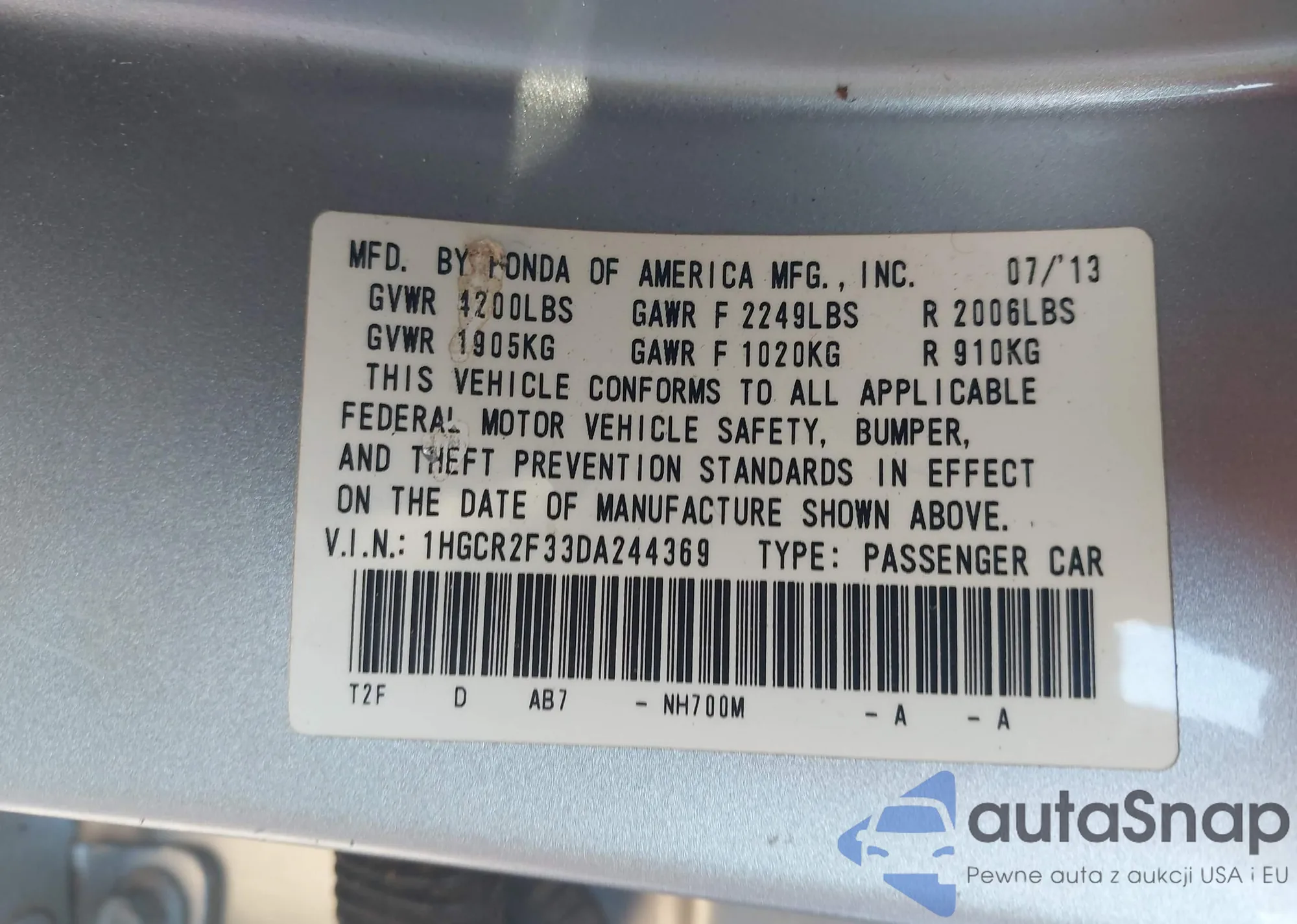 LOT: 43642475 VIN: 1HGCR2F33DA244369