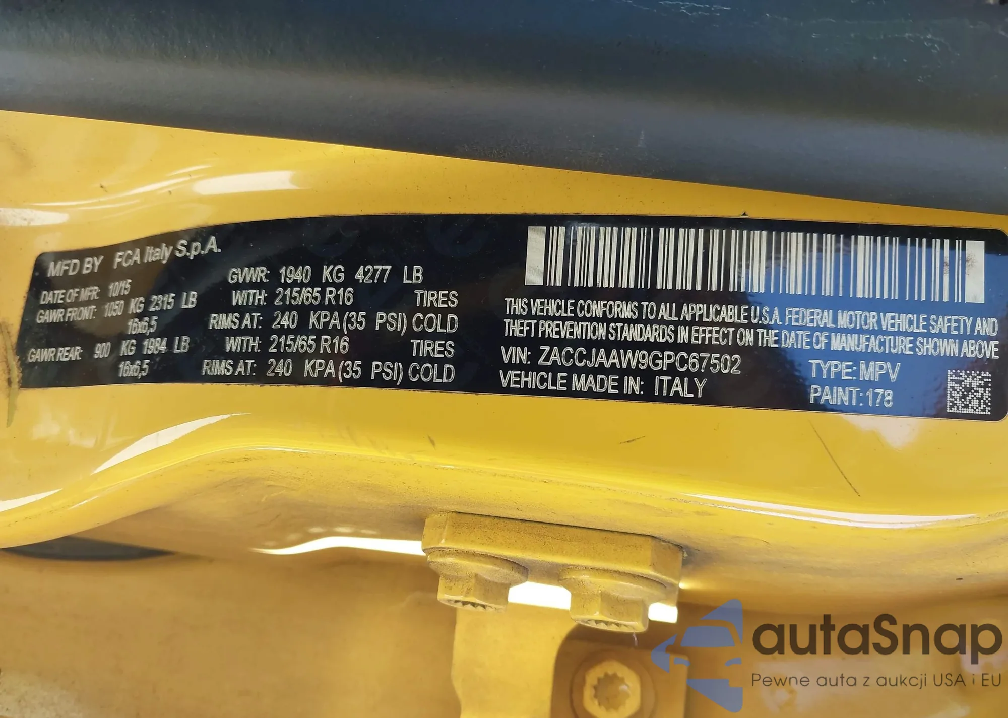 LOT: 43685503 VIN: ZACCJAAW9GPC67502