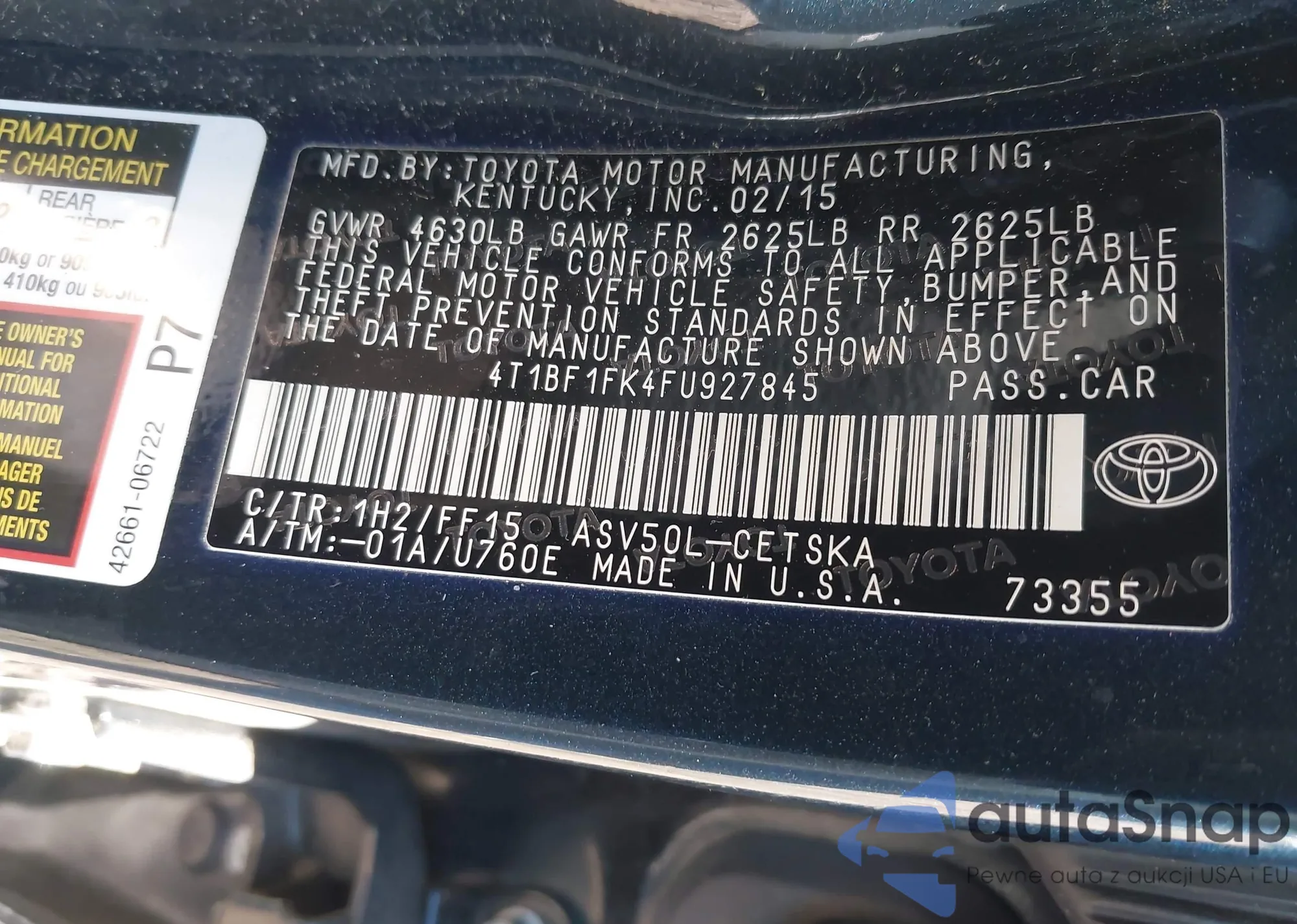 LOT: 43758510 VIN: 4T1BF1FK4FU927845