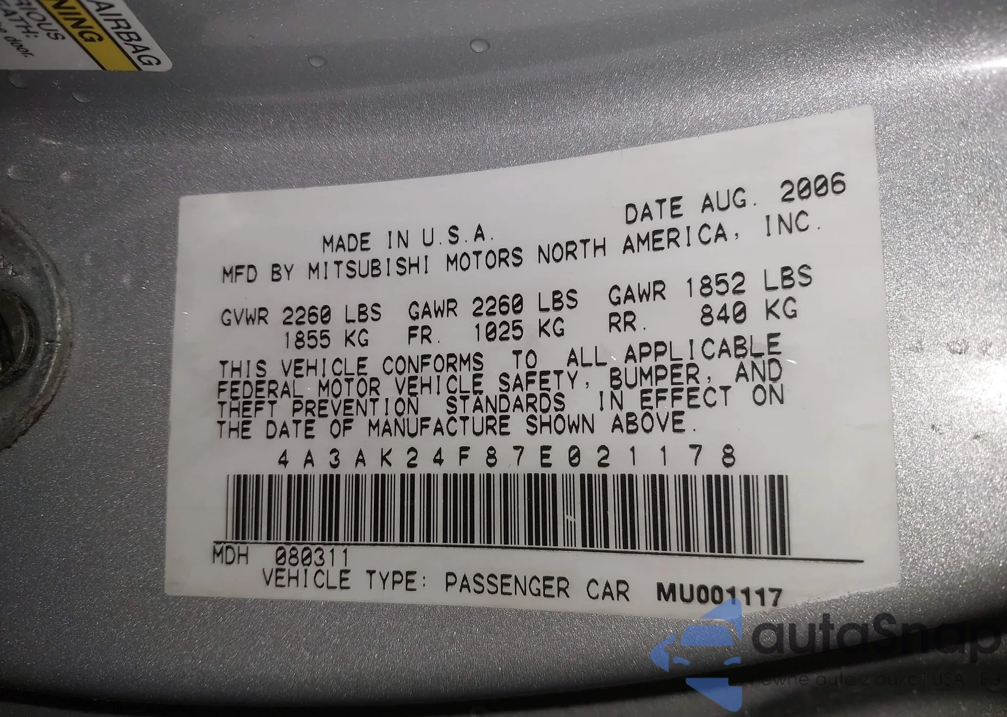 • VIN 4T1BF1FK4FU927845