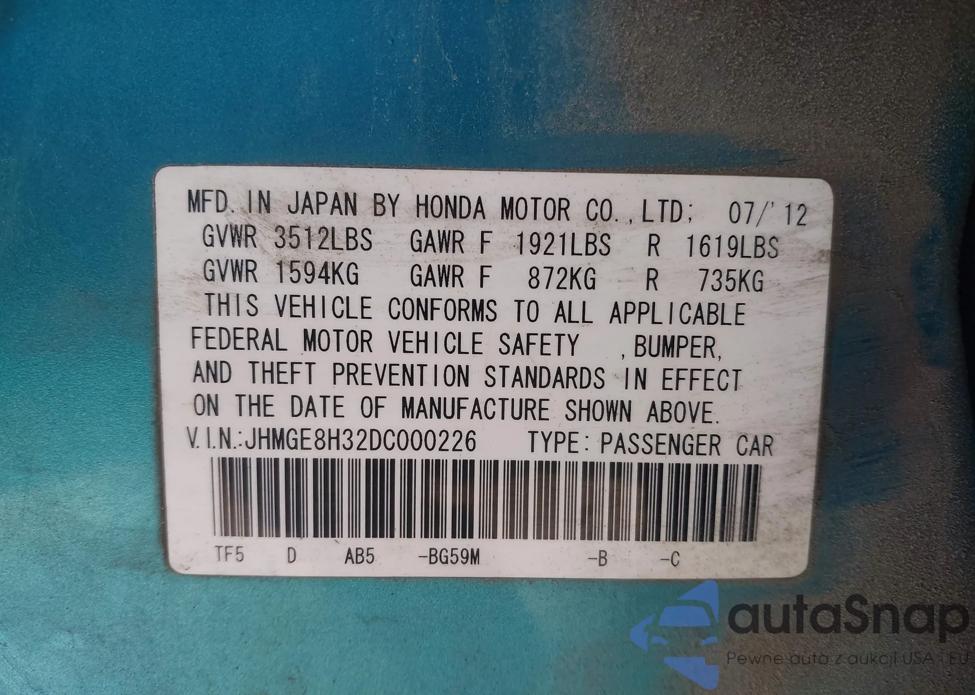 • VIN JHMGE8H32DC000226