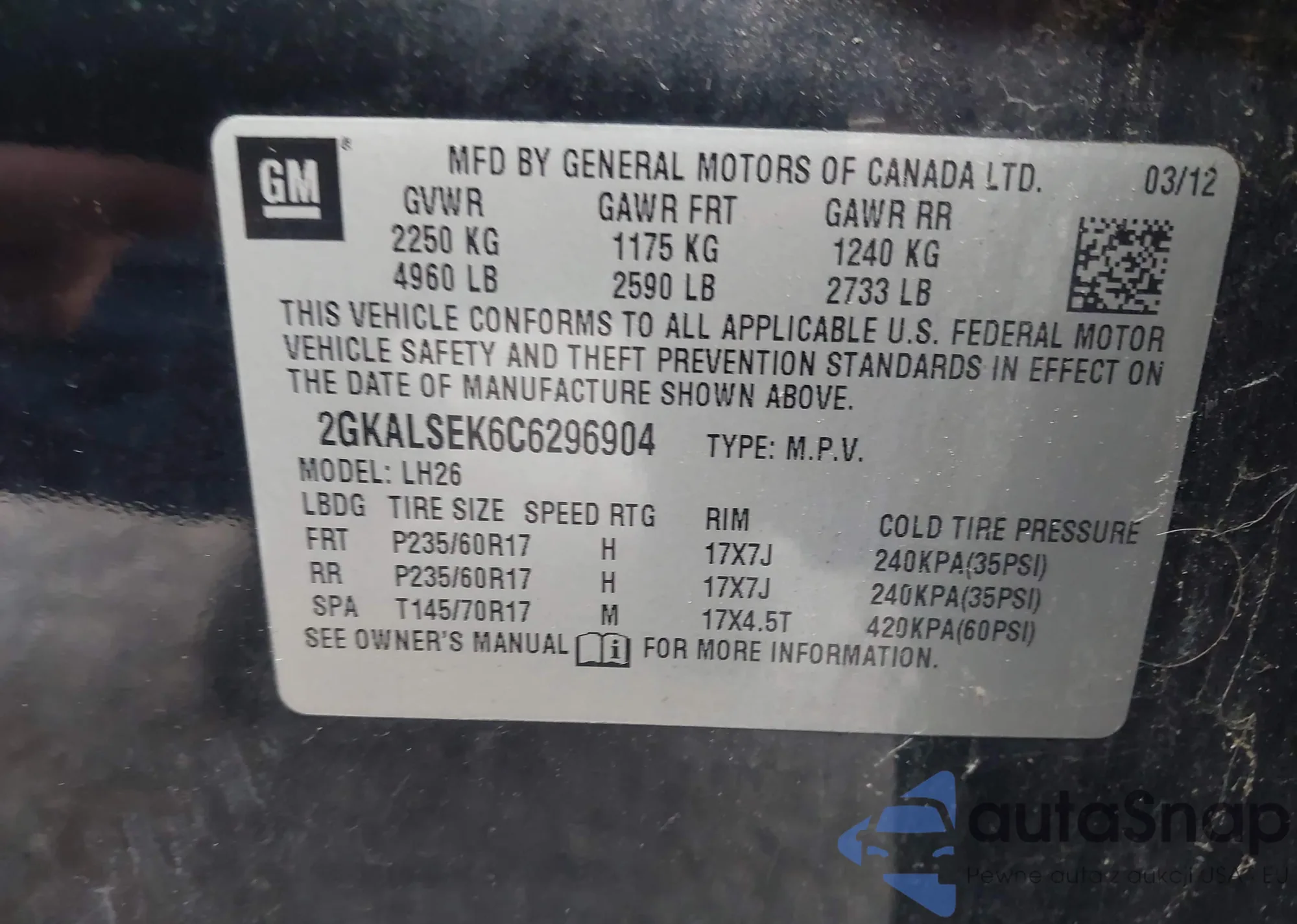 • VIN 2GKALSEK6C6296904
