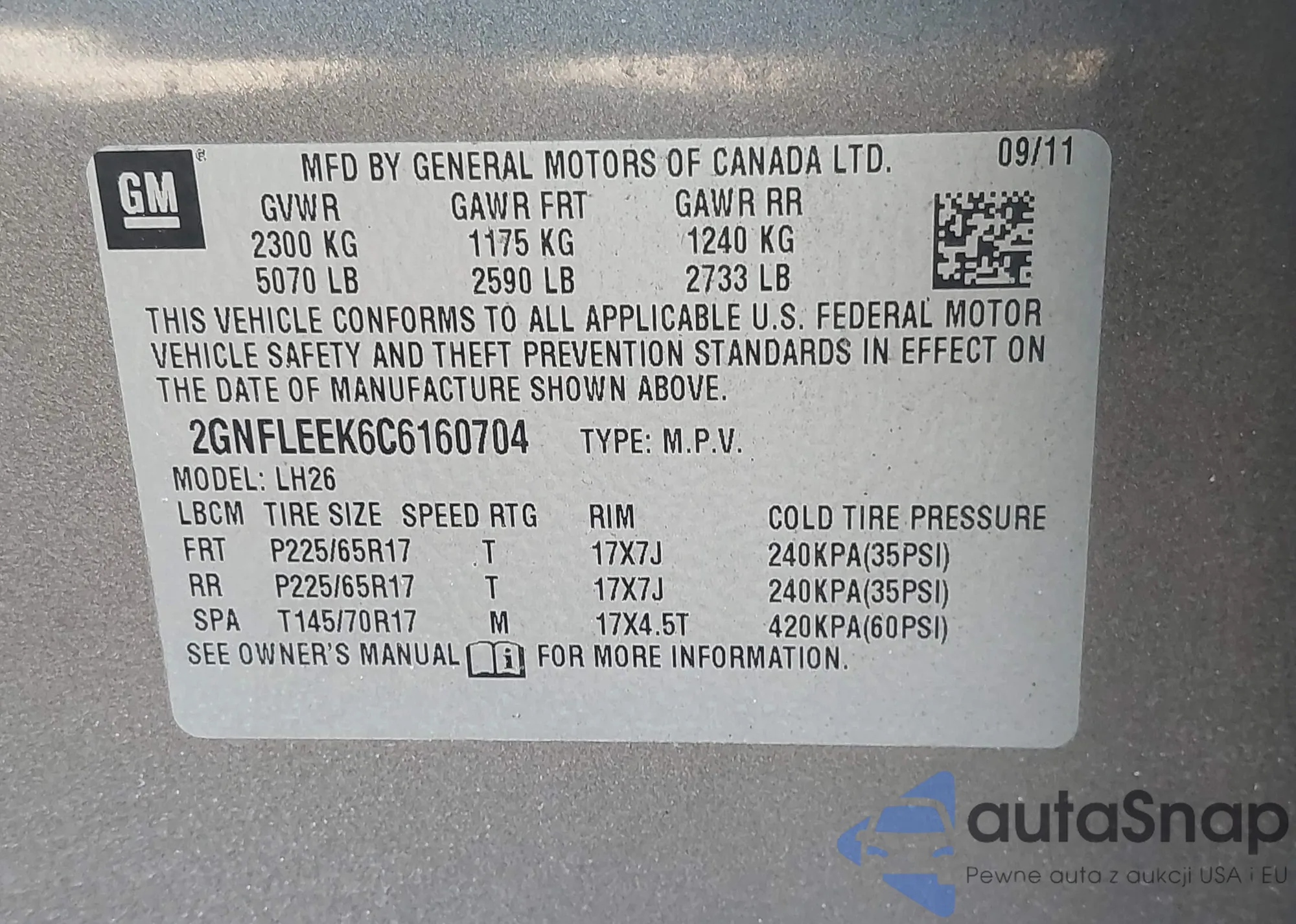 • VIN 2GNFLEEK6C6160704