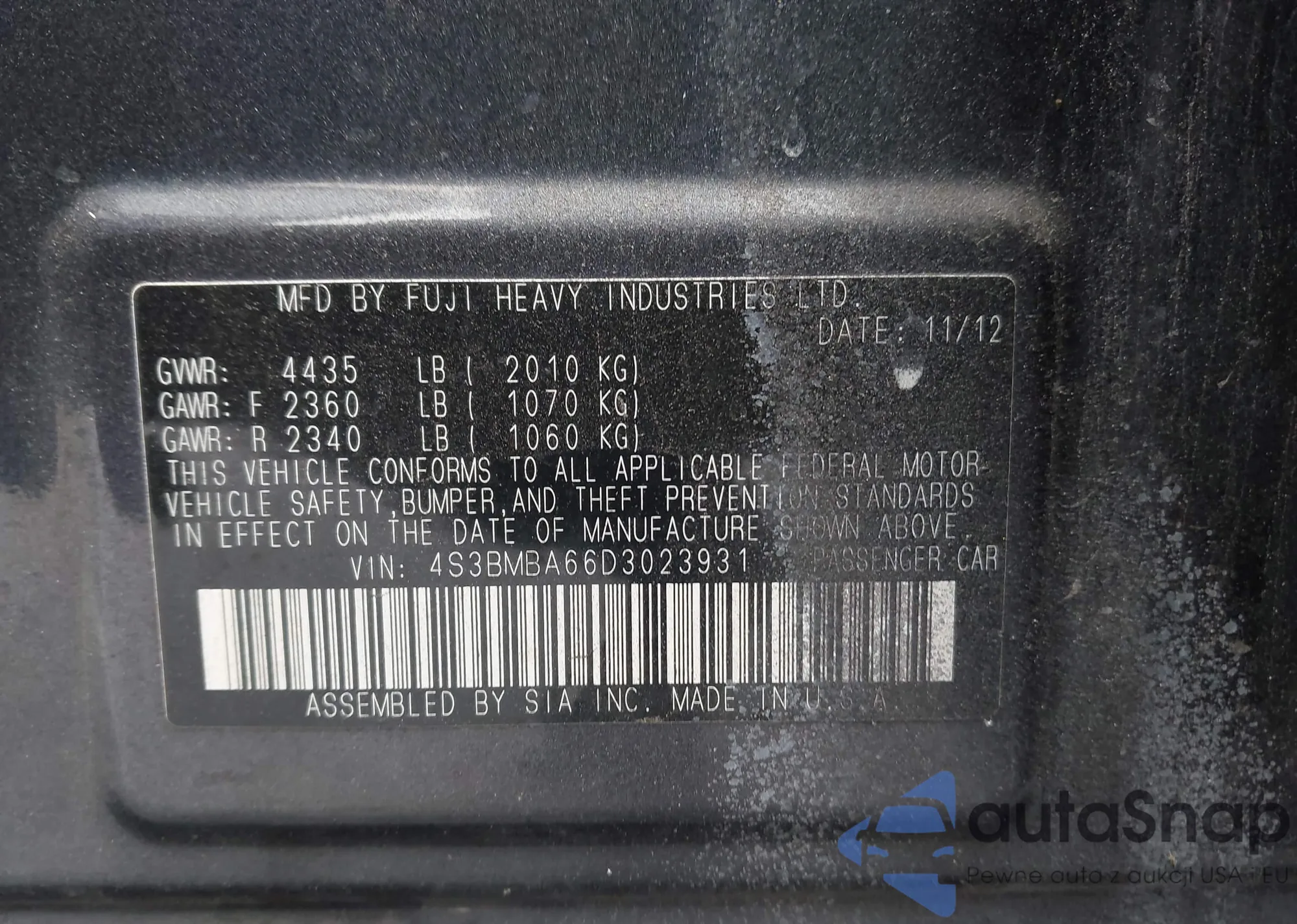 • VIN 4S3BMBA66D3023931