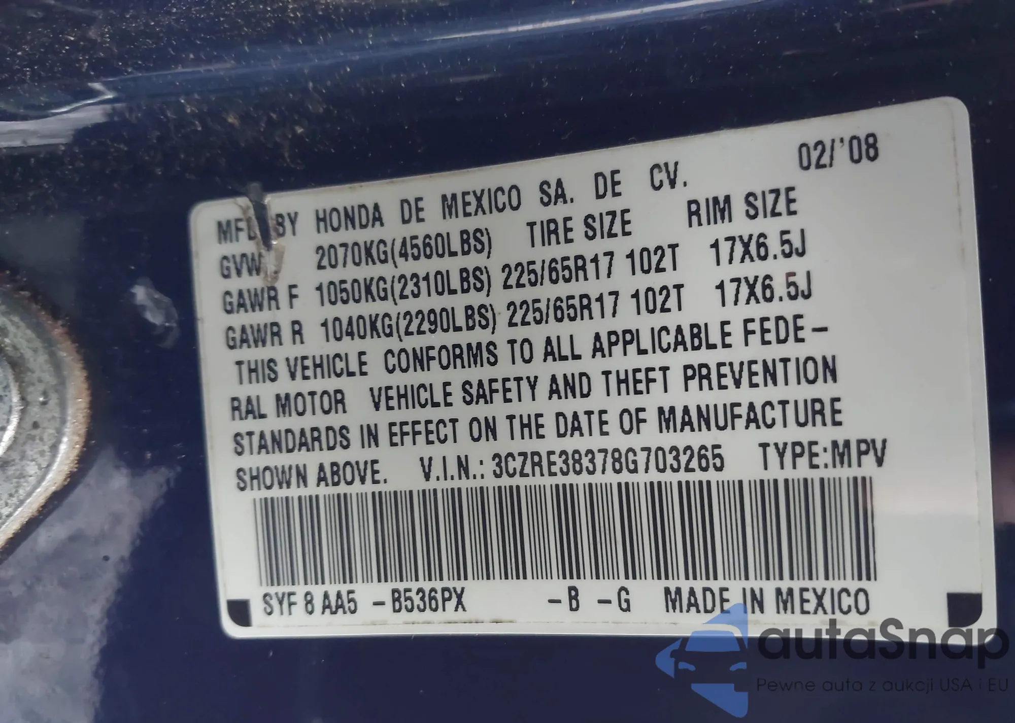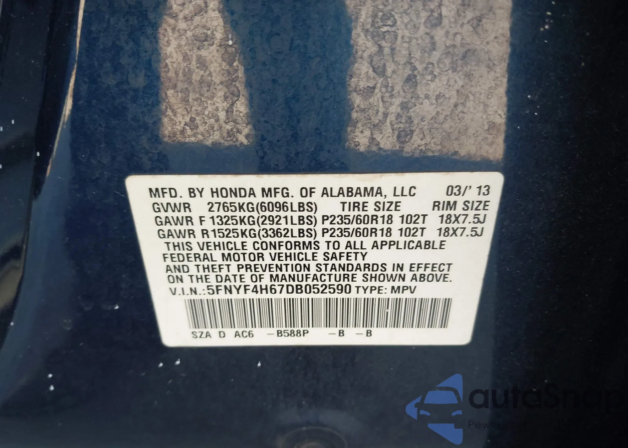 • VIN 5FNYF4H67DB052590