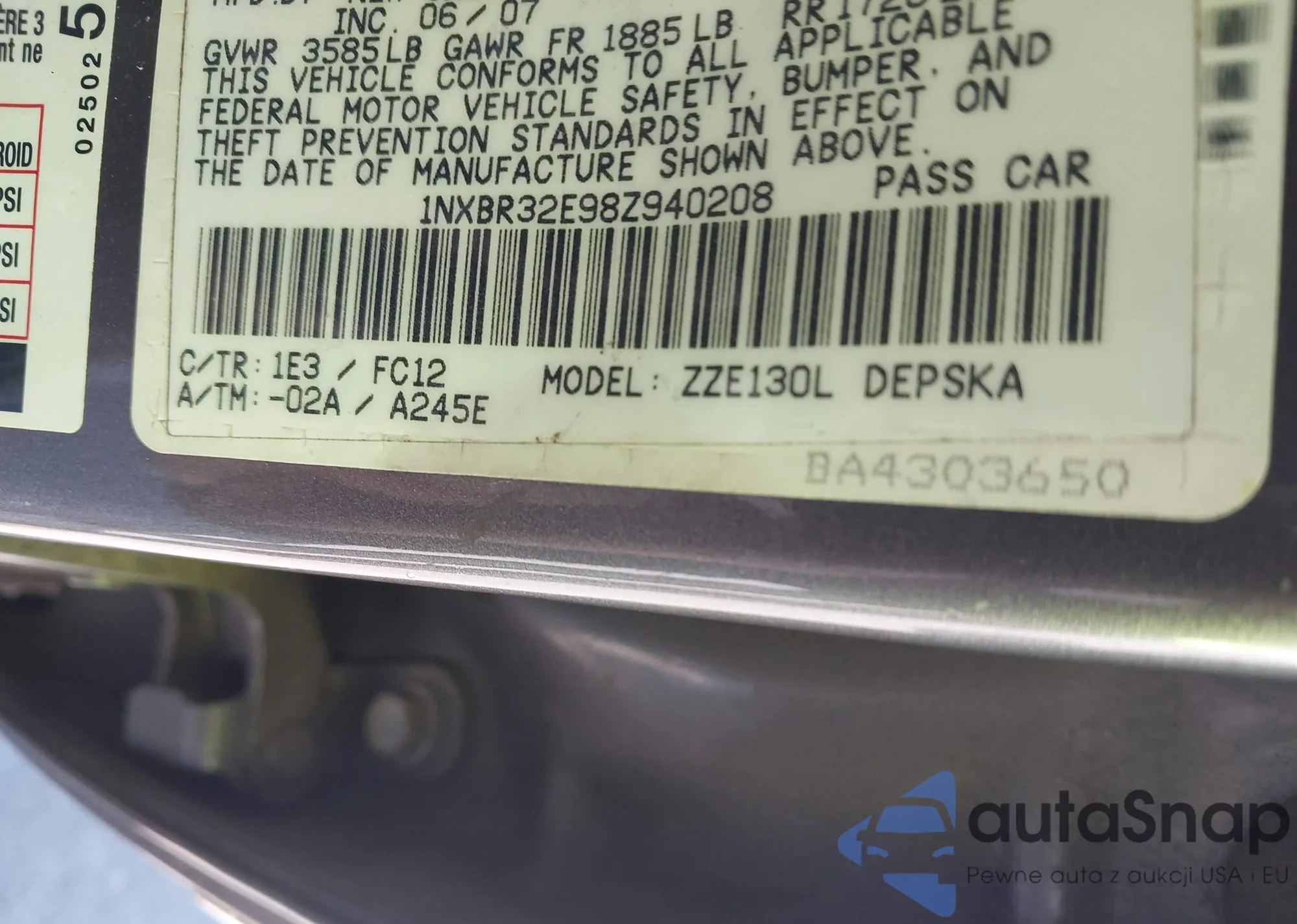 LOT: 43509551 VIN: 1NXBR32E98Z940208