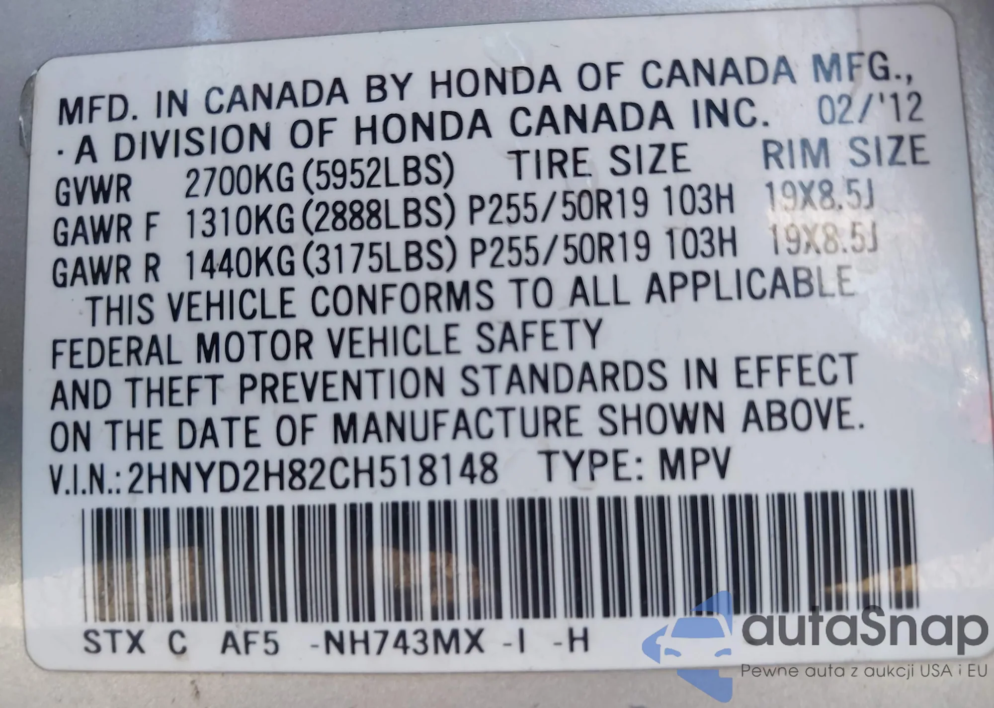 • VIN 2HNYD2H82CH518148