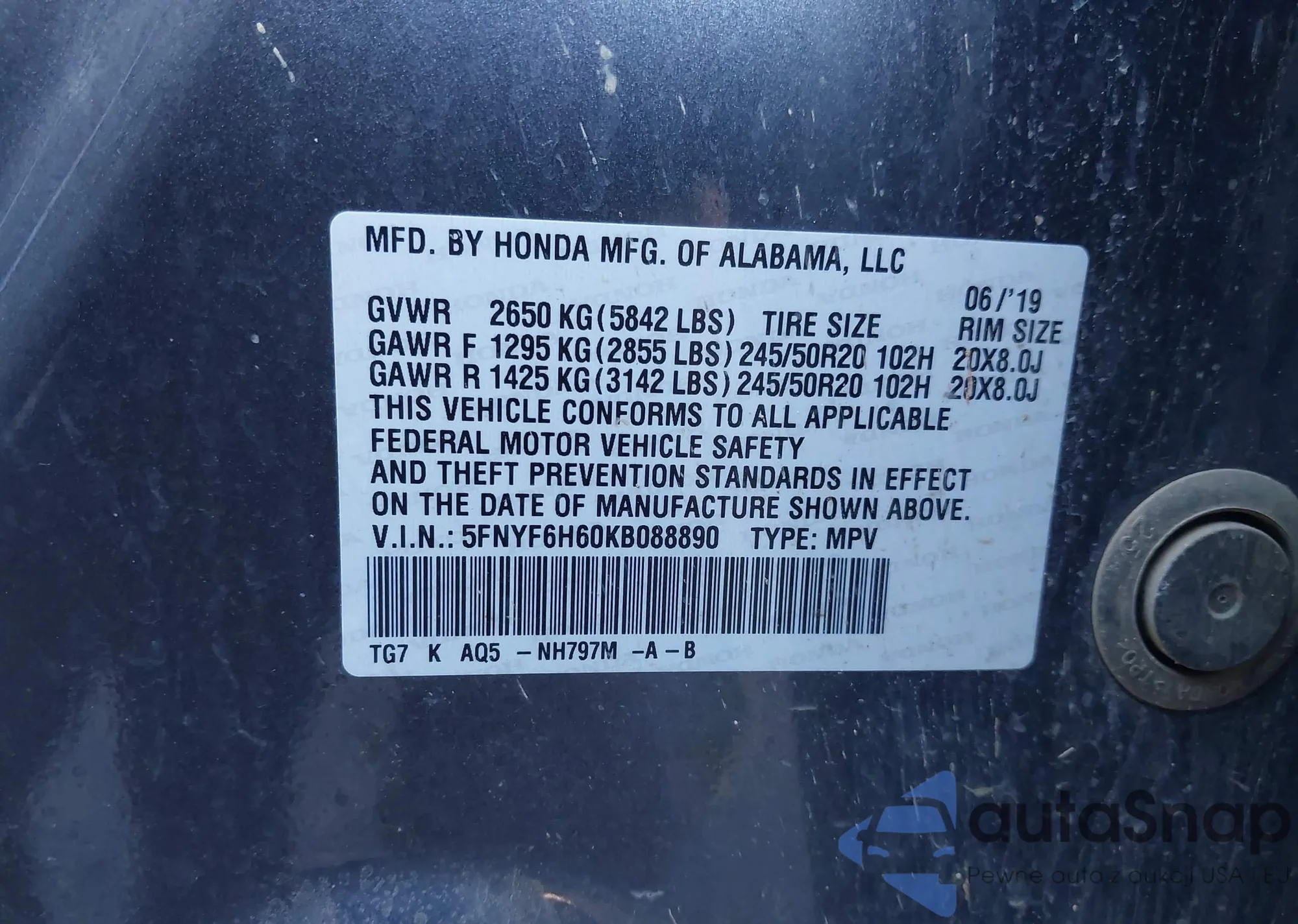 LOT: 43458400 VIN: 5FNYF6H60KB088890
