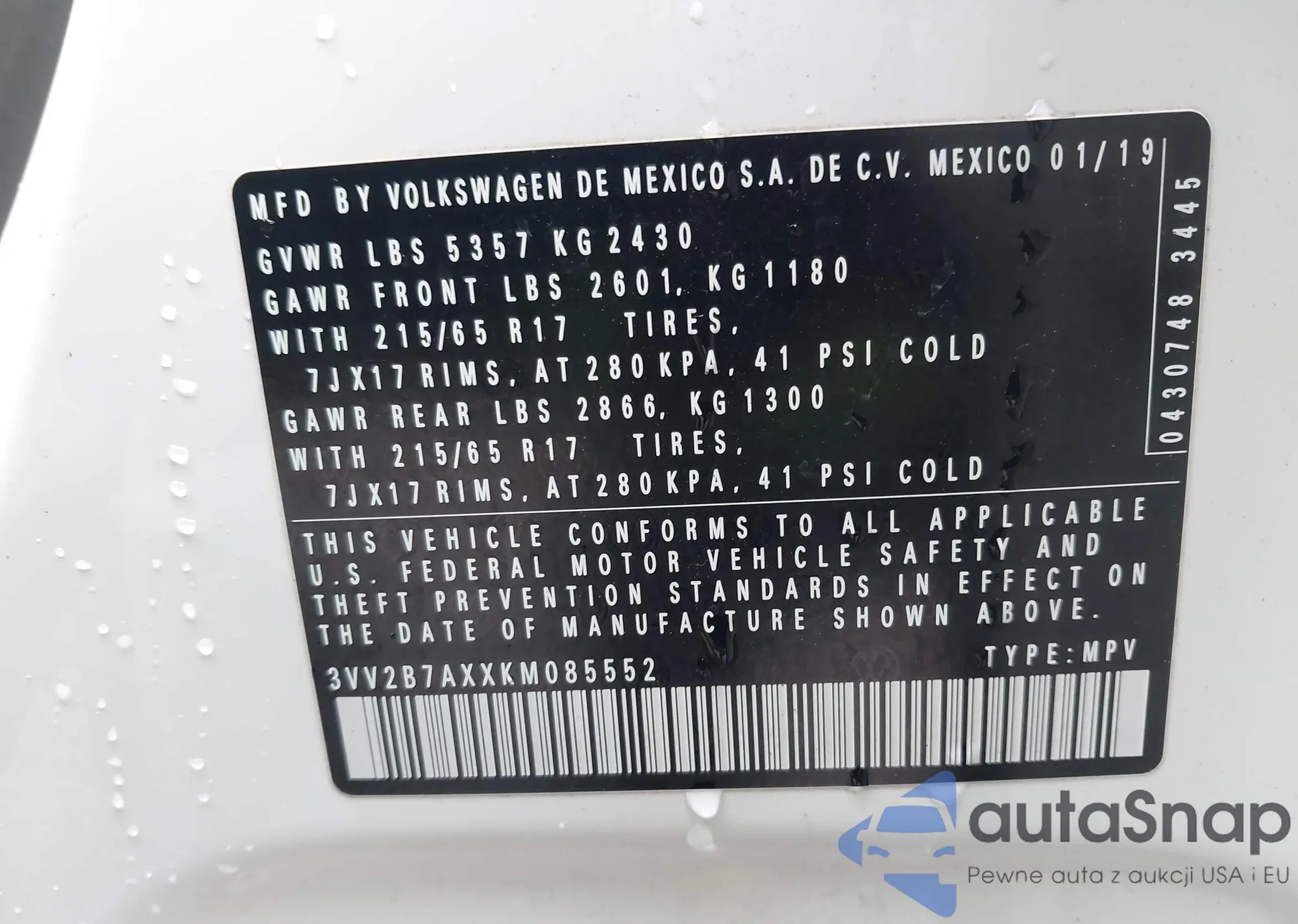 • VIN 3VV2B7AXXKM085552