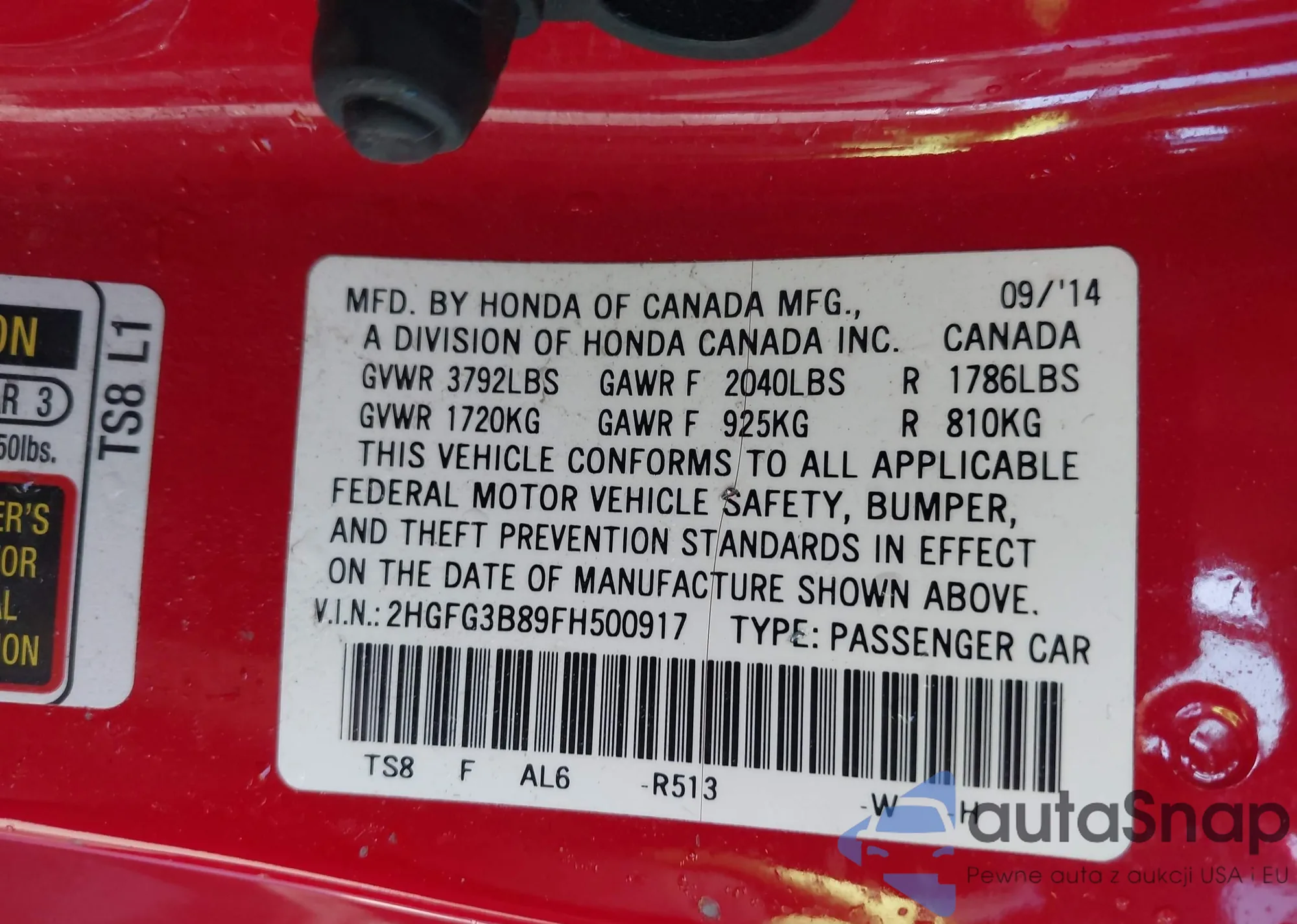 • VIN 2HGFG3B89FH500917