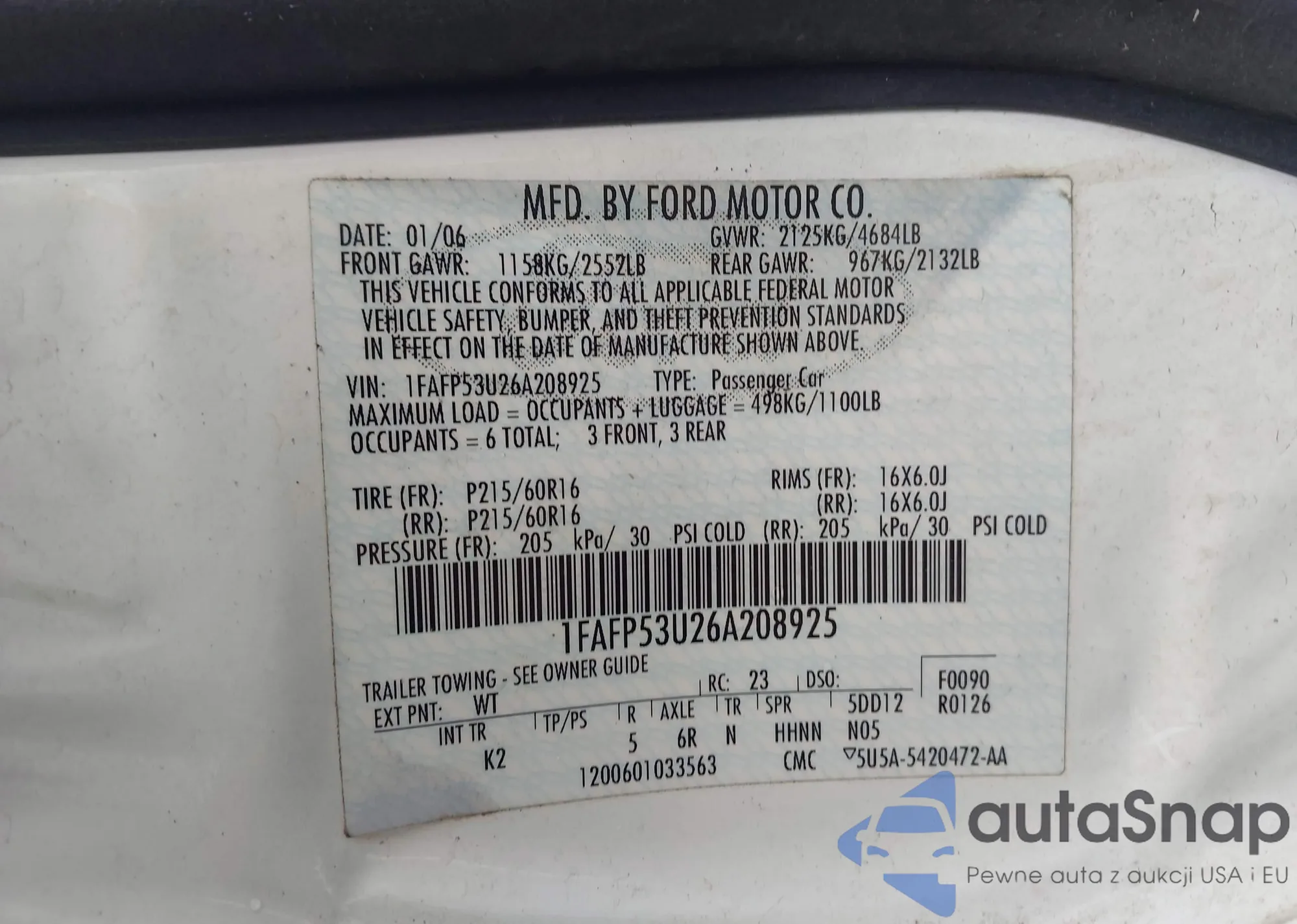 • VIN 1FAFP53U26A208925