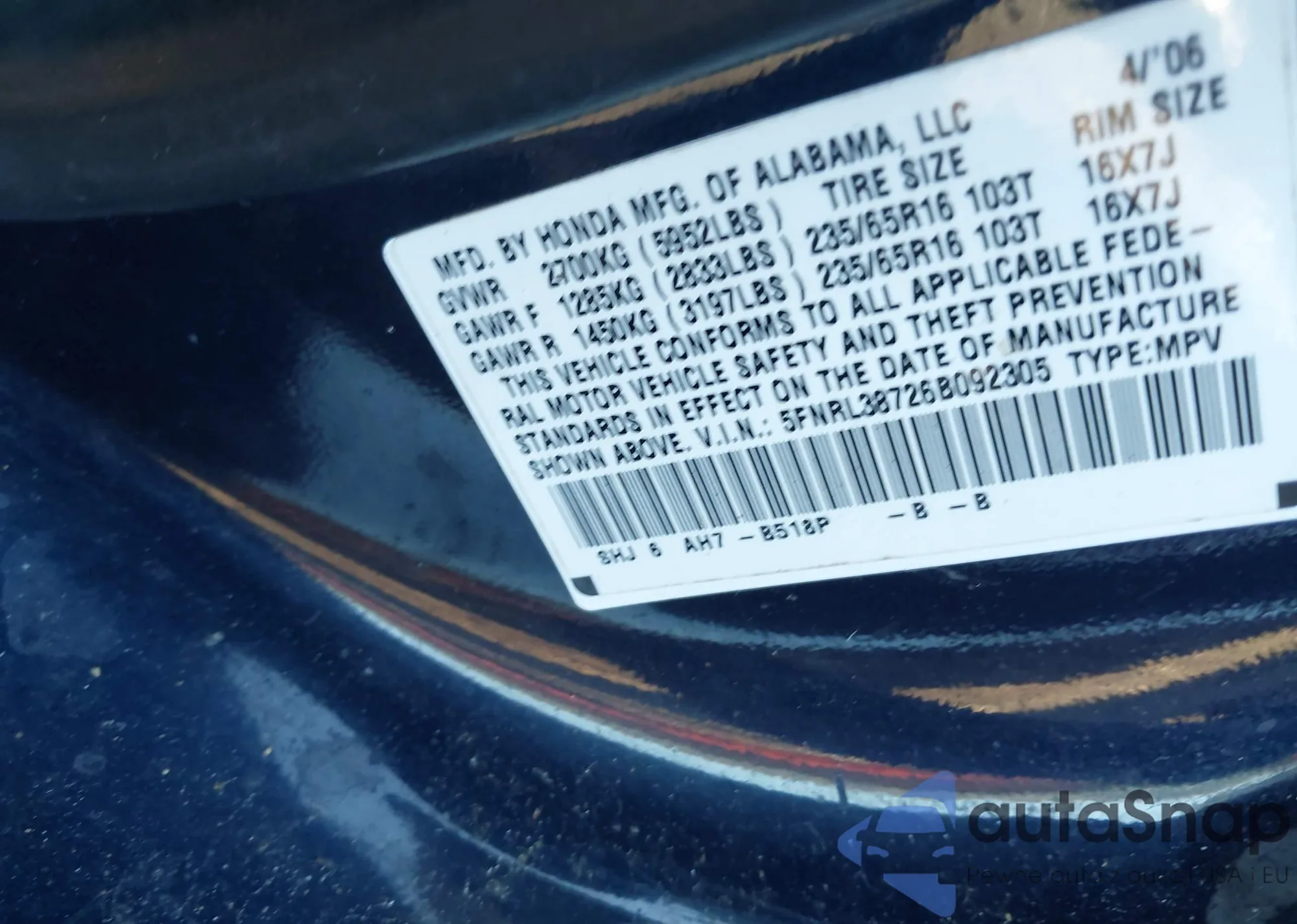 • VIN 5FNRL38726B092305