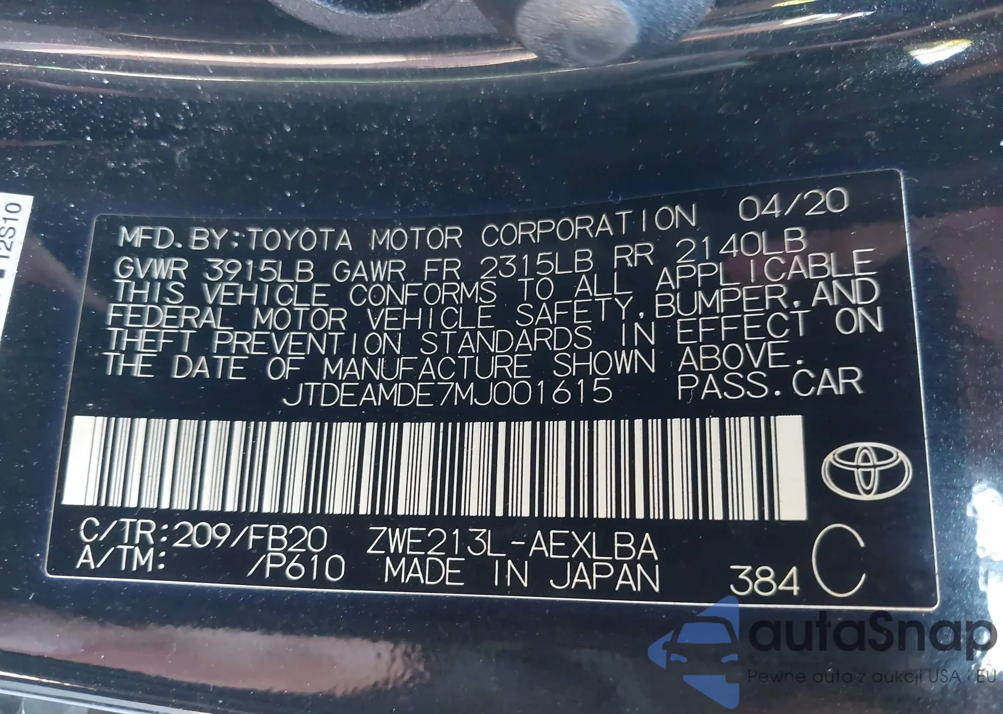 LOT: 43815638 VIN: JTDEAMDE7MJ001615