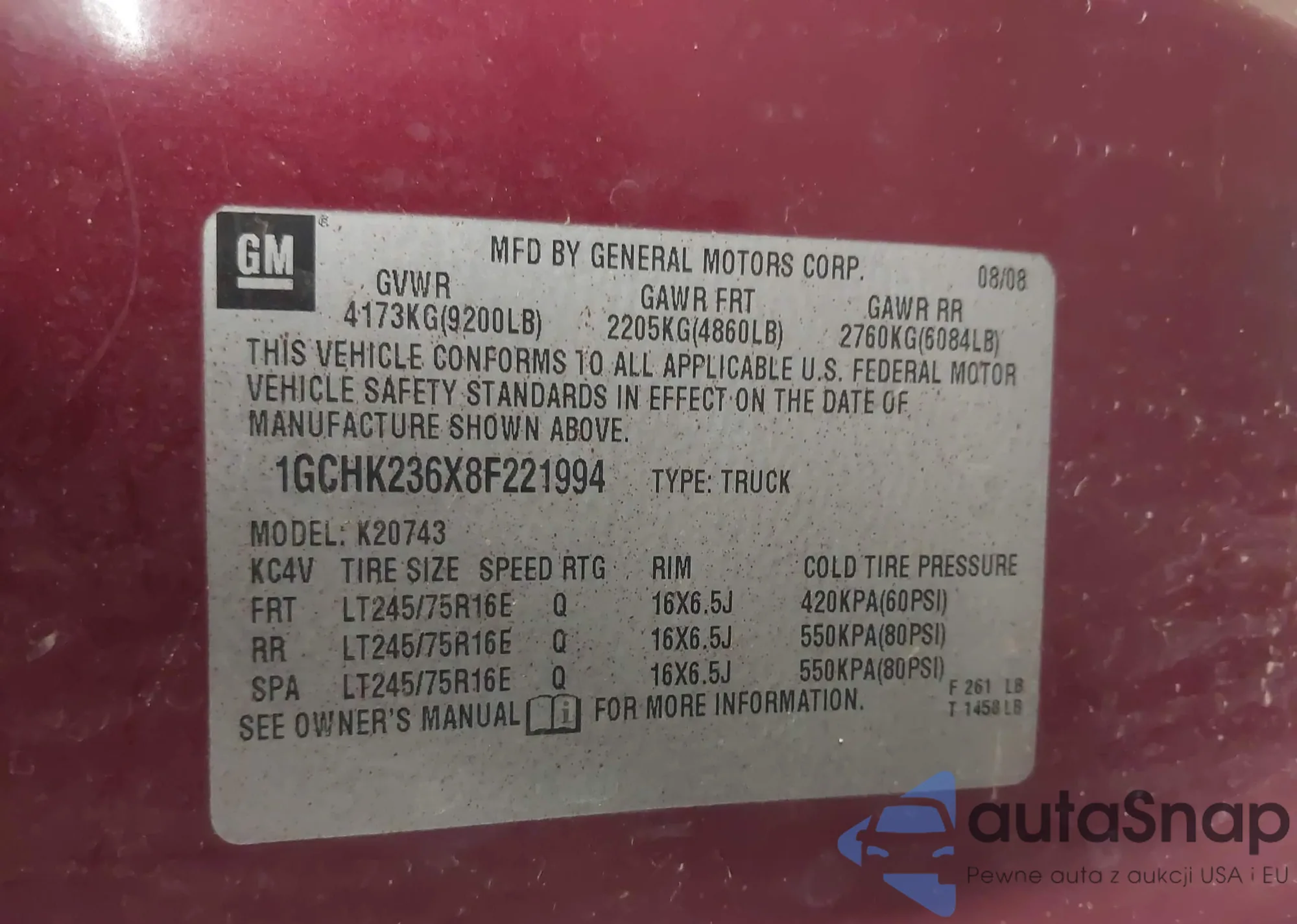 LOT: 43468610 VIN: 1GCHK236X8F221994