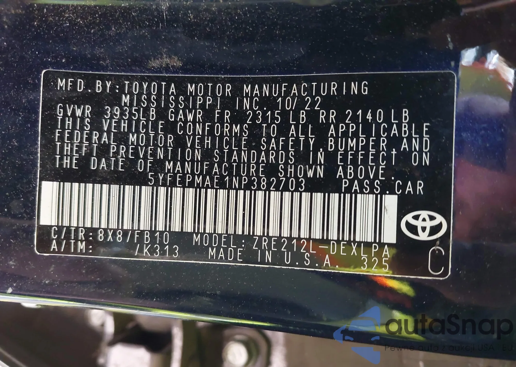 LOT: 43272567 VIN: 5YFEPMAE1NP382703
