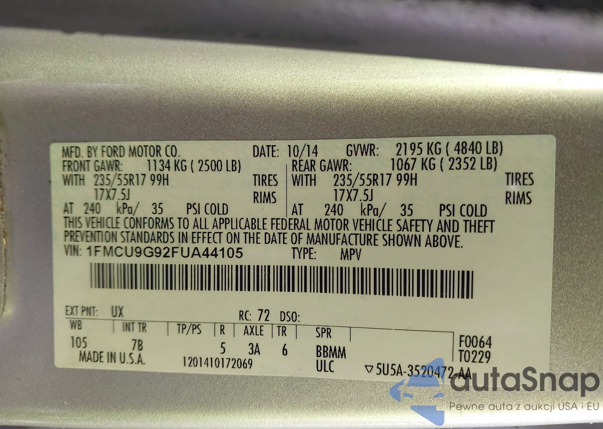 LOT: 43587349 VIN: 1FMCU9G92FUA44105
