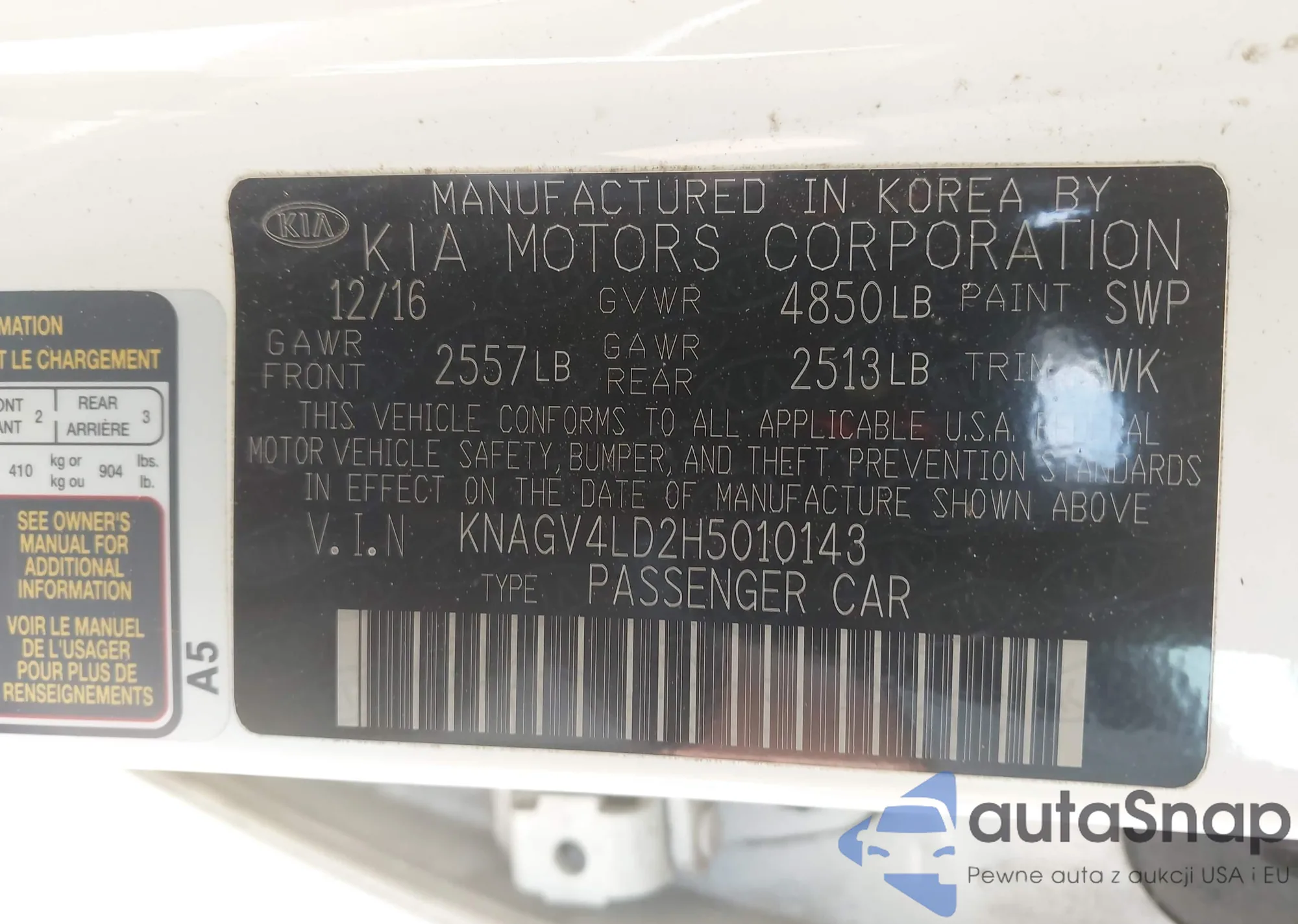 LOT: 43272047 VIN: KNAGV4LD2H5010143