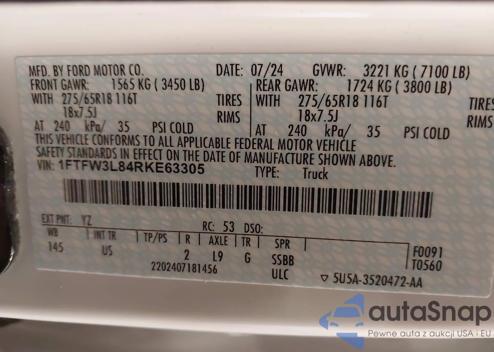 LOT: 43008488 VIN: 1FTFW3L84RKE63305
