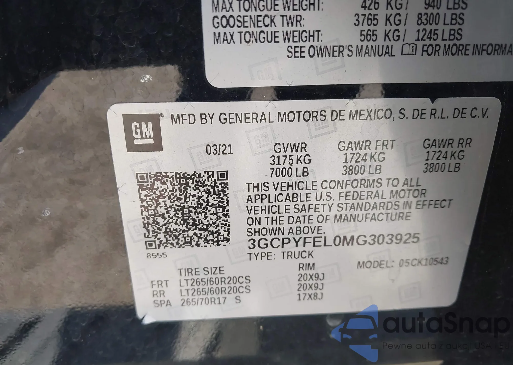 LOT: 43010837 VIN: 3GCPYFEL0MG303925