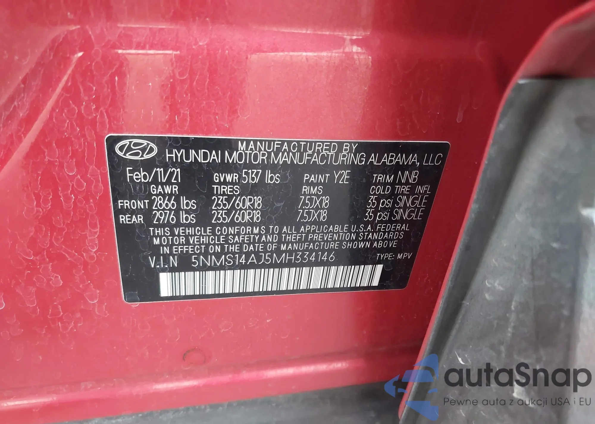 LOT: 43354085 VIN: KM8J3CA25HU353699