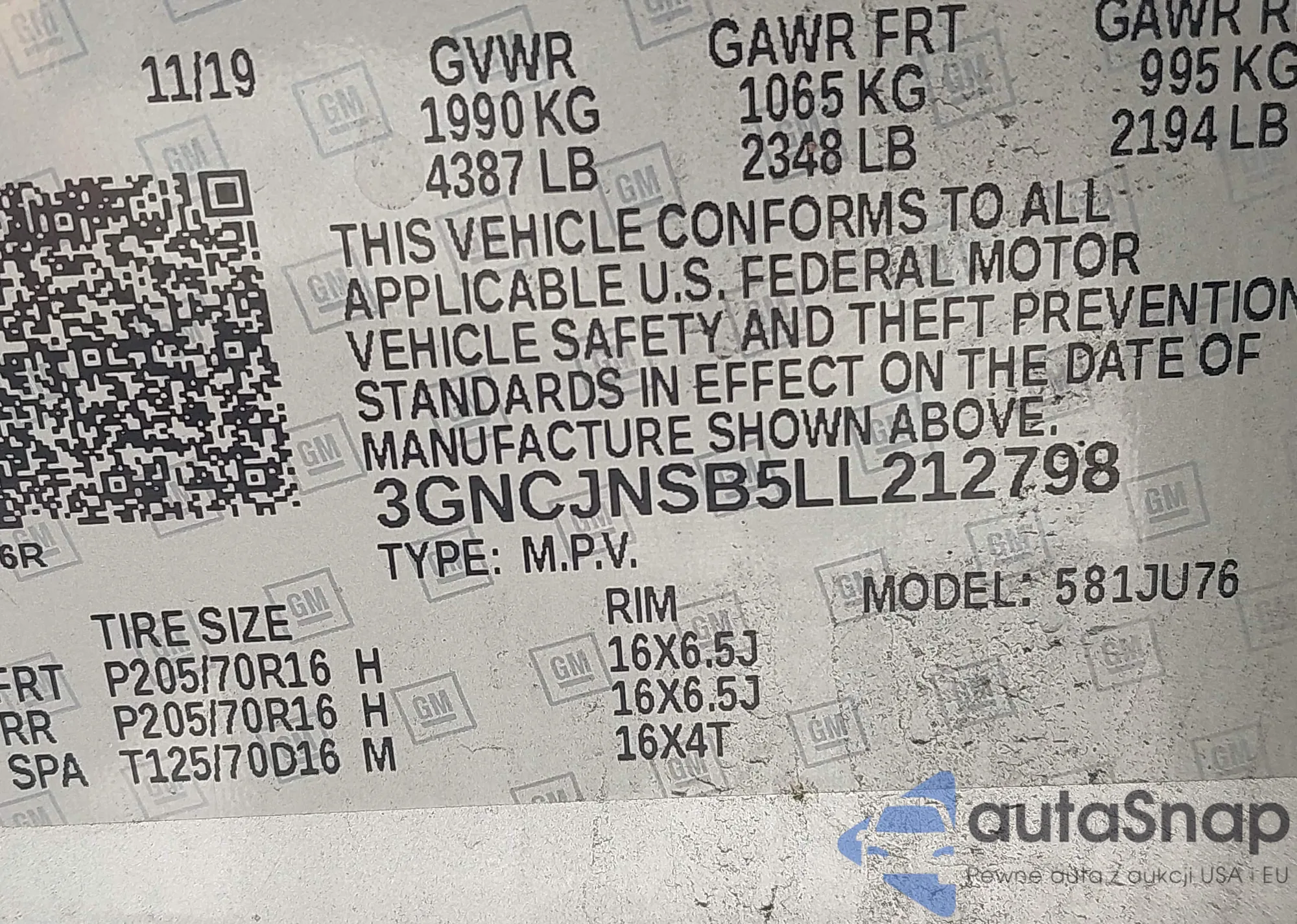 LOT: 43163879 VIN: 3GNCJNSB5LL212798