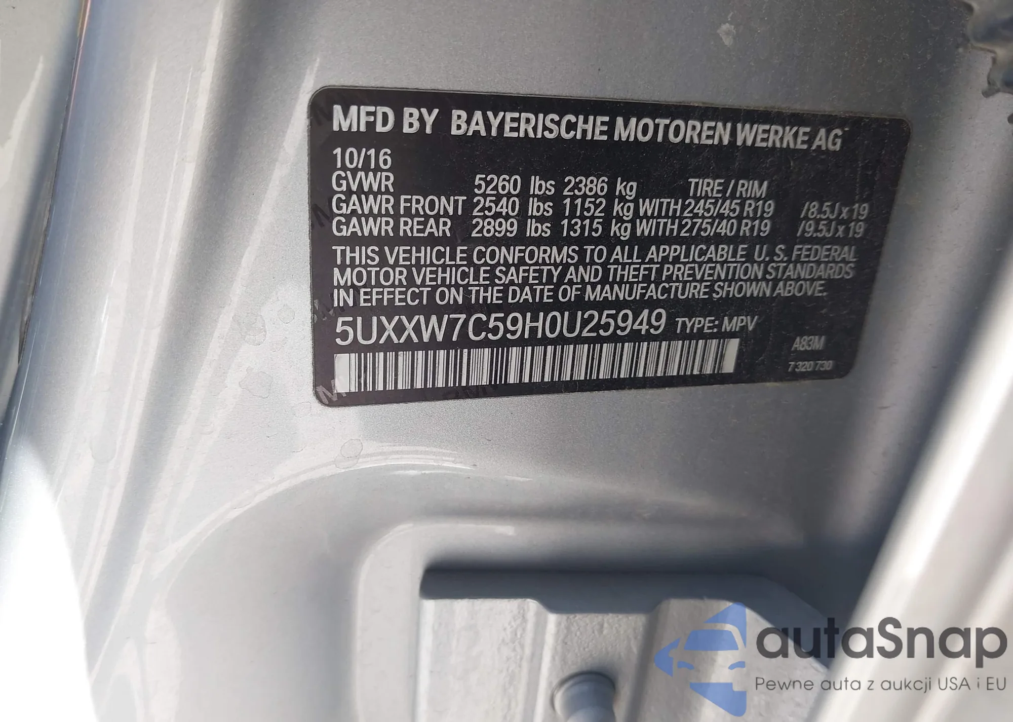 LOT: 43245359 VIN: 5UXXW7C59H0U25949