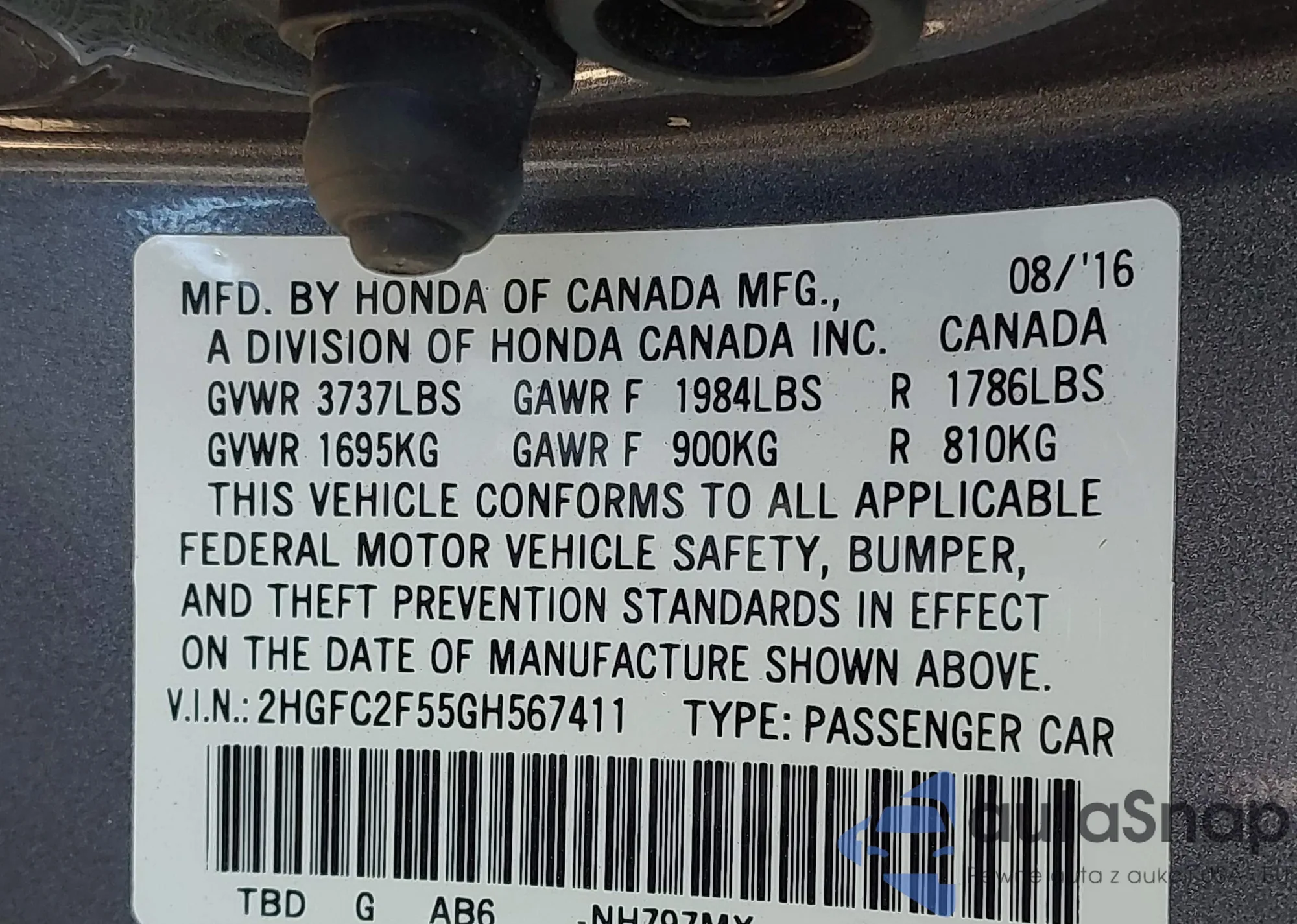LOT: 43279012 VIN: 2HGFC2F55GH567411